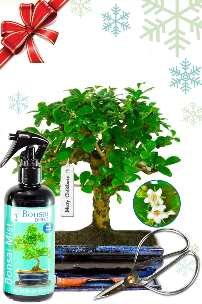 A beautiful 6-year-old Fukien Tea Tree (Carmona microphylla) bonsai in a blue ceramic pot with drip tray. Includes pruning scissors, bonsai mist, and a porcelain “Merry Christmas” tag. A flowering indoor bonsai that symbolises courage, heart, and love — a charming, eco-friendly Christmas gift.
