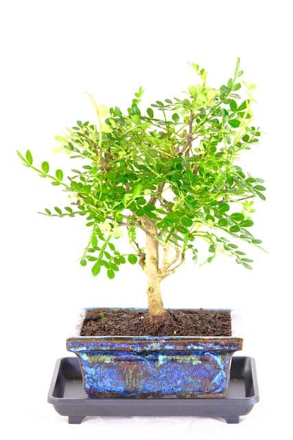 The Aromatic Pepper bonsai is an exquisite and artistic specimen, known for its fragrant foliage that can fill an entire room. It is potted in a charming blue ceramic bonsai pot, enhancing its overall appeal and ensuring proper care. Appropriately sized drip tray is included with this bonsai!