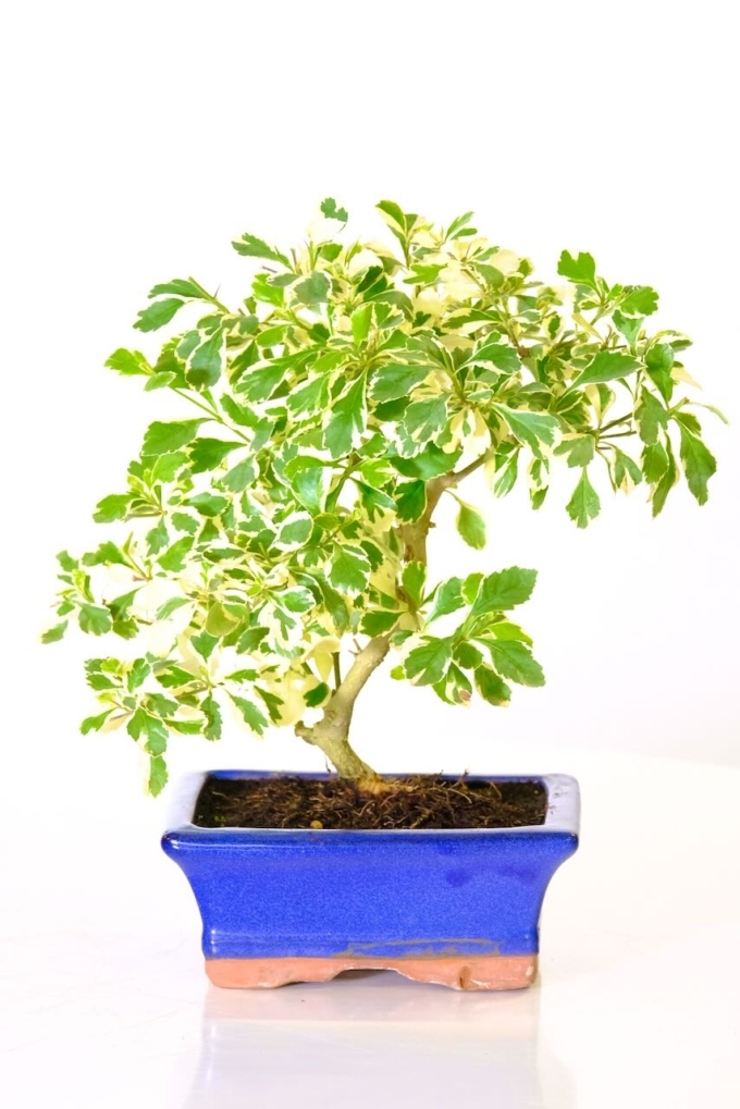 This bonsai is a gently twisty Durantha repens “Variegata”. It is recognised by its evergreen nature and covered with green and white variegated leaves. It’s still in its youthful stage, ready for growth and more styling! Throughout the warmer seasons, it blossoms lovely purple flowers! Comes potted in a vibrant blue ceramic pot along with a matching drip tray. The shari feature on the trunk is fantastic!