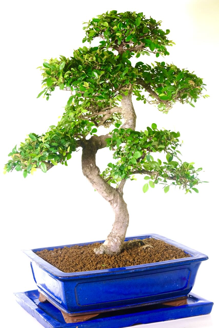 Potted in a sleek, glossy and very tasteful deep blue ceramic pot, its elegant, highly-defined structure allows light to dance between refined, twiggy branches, highlighting the tree’s exceptional shape and flowing trunk. The natural spacing offers a full appreciation of its artistry, making it both a peaceful focal point and a conversation piece.