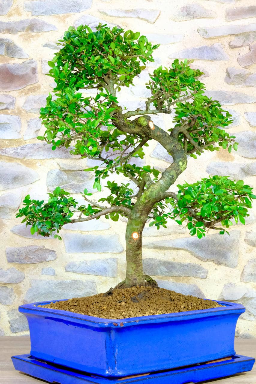 Potted in a rich royal blue glazed ceramic bonsai pot with a matching drip tray, this bonsai is a true showpiece. The contrast between the glossy pot and the vibrant green foliage creates a visually striking effect that enhances any interior space.
