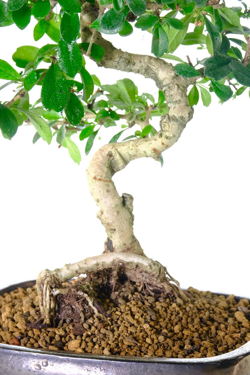 Presented in a metallic black ceramic pot with a matching drip tray, this bonsai introduces a touch of sophistication, effortlessly blending with any interior décor. The exposed roots are another noteworthy feature of this unique and interesting bonsai tree; they add a naturalness to the overall bonsai composition.
