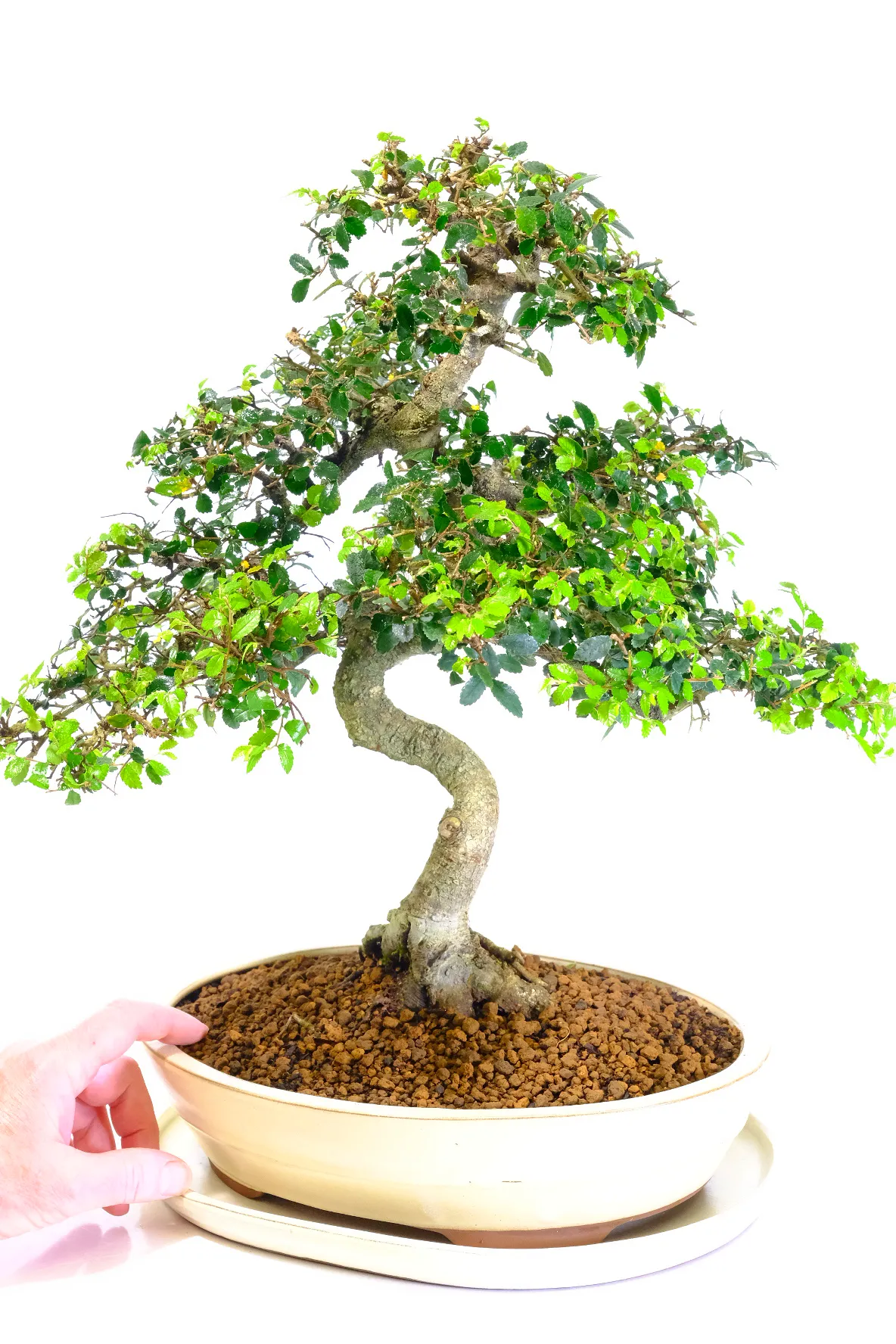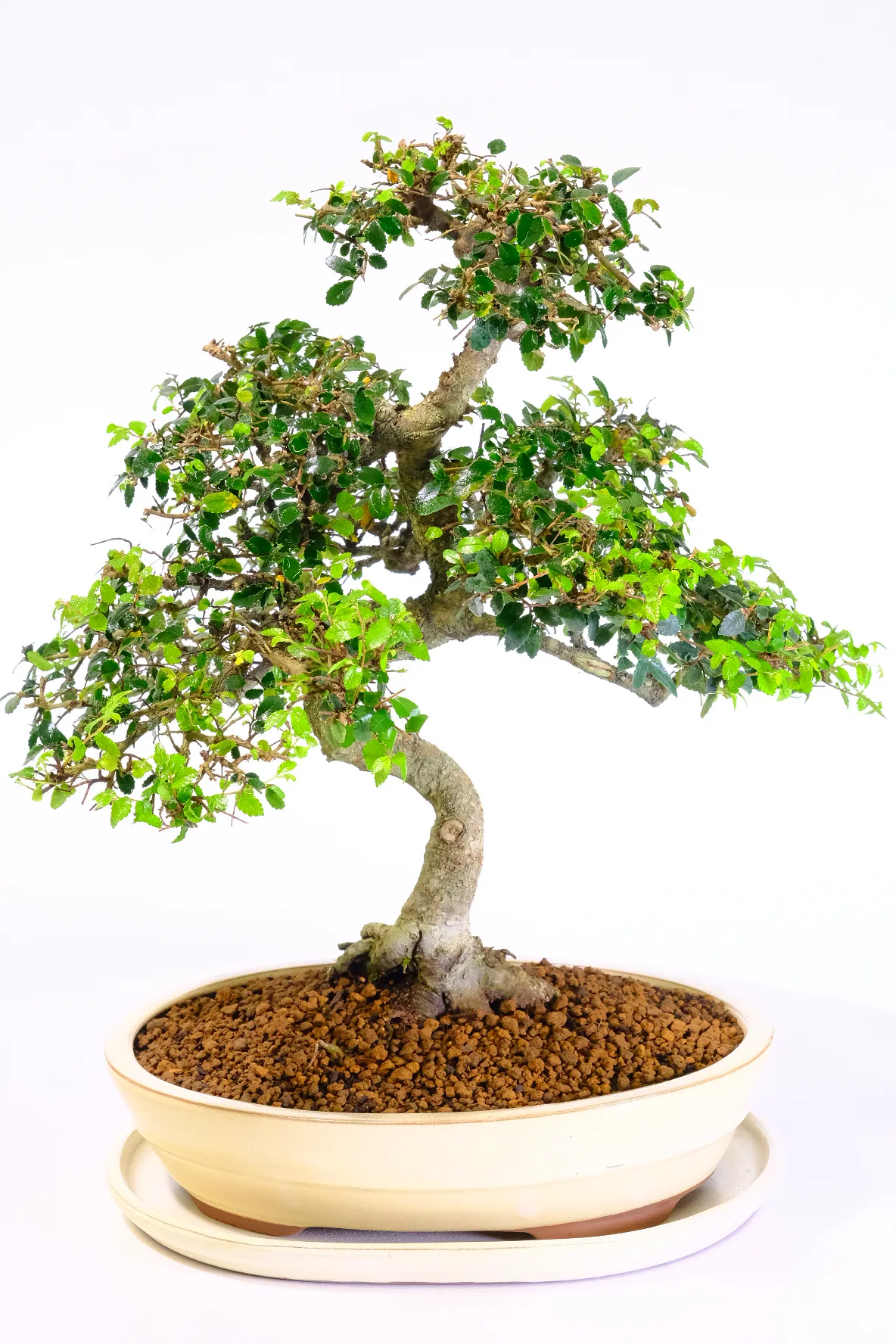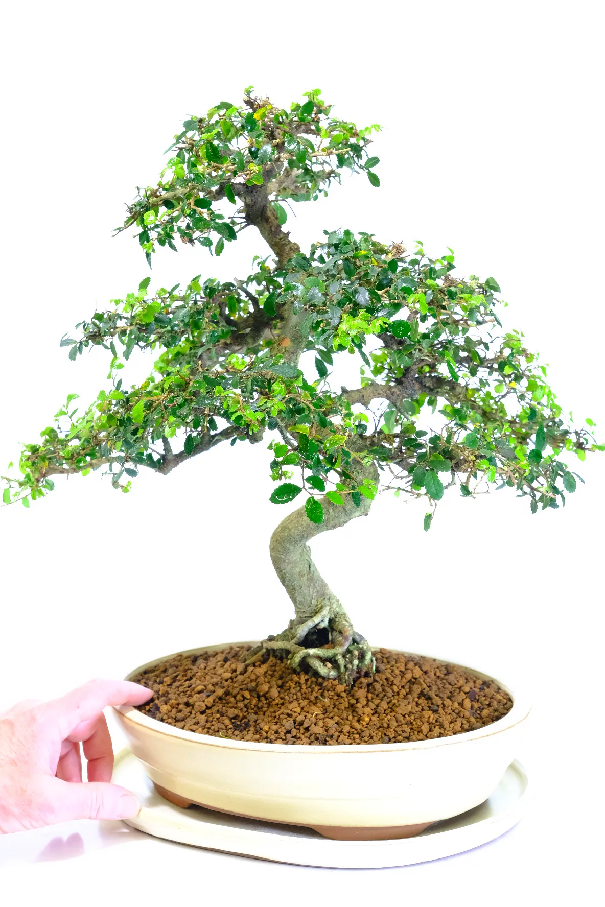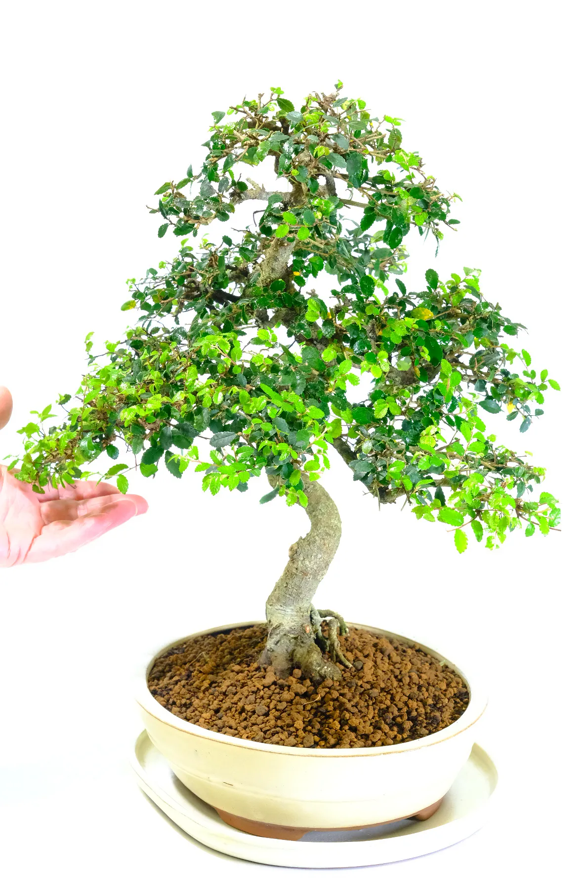 Our premium indoor bonsai trees are presented in ceramic pots with matching drip trays, protecting your surfaces and enhancing humidity for bonsai health during winter. This bonsai is potted in a very tasteful neutral cream pot which perfectly compliments the colour of the foliage.
