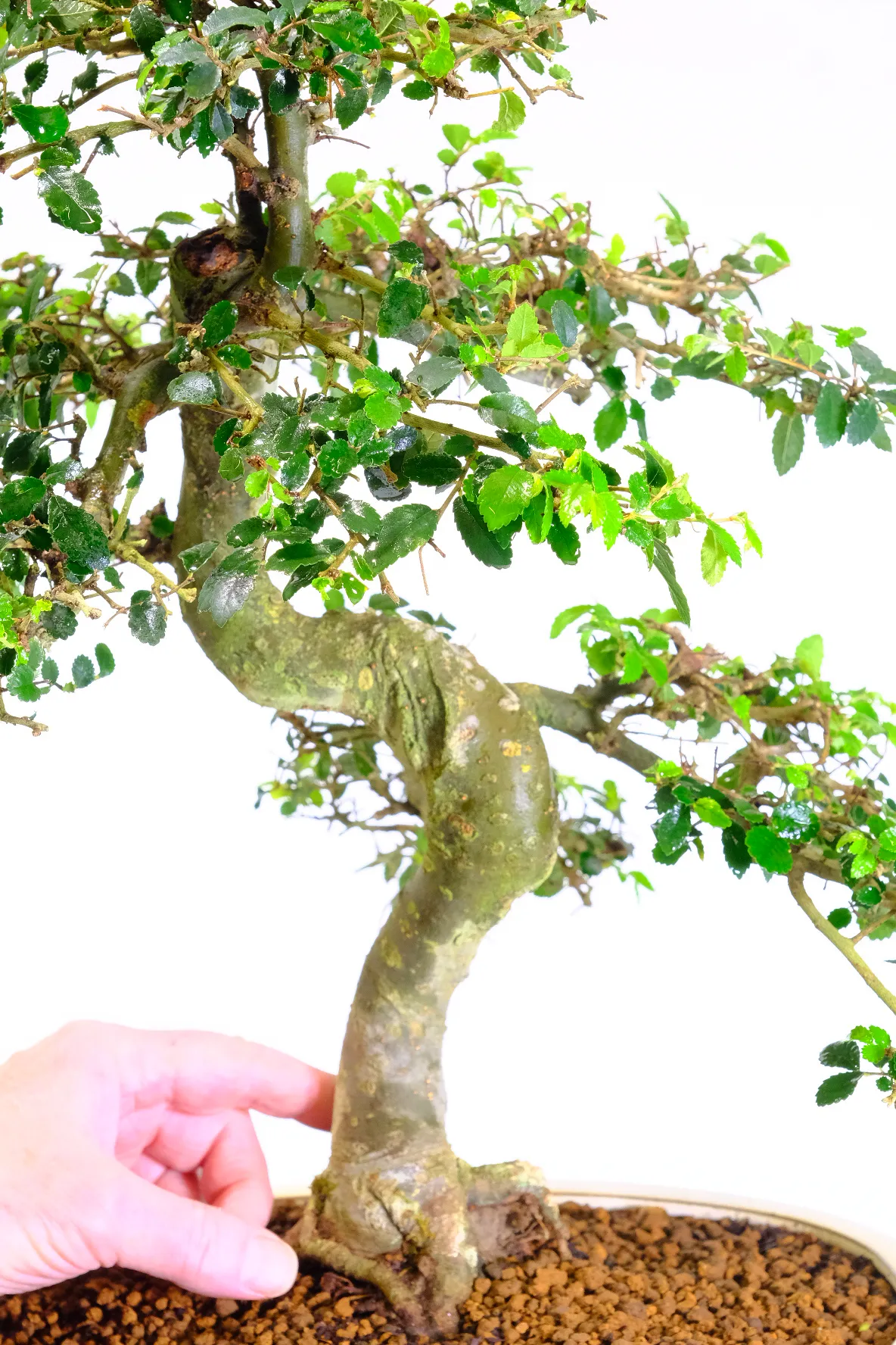 A 24-year-old Chinese elm bonsai tree with a very powerful and strong trunk form. Its sinuous form is a testament to its age and the skilled cultivation techniques applied over more than a decade.