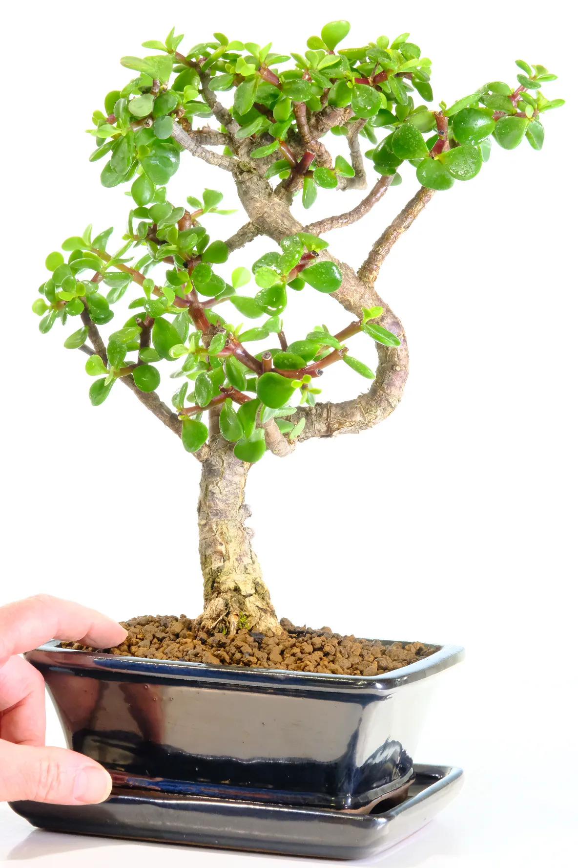 This outstanding Twisty Money Tree Bonsai (Portulacaria afra) brings both charm and personality into your home. You will receive this exact bonsai, individually photographed to show its beautifully sculpted trunk and neat, compact canopy. Styled in an informal upright design, it features dramatic twists and flowing lines that give it a striking serpentine character. Although artistic, it still retains a natural, organic feel that makes it especially appealing.