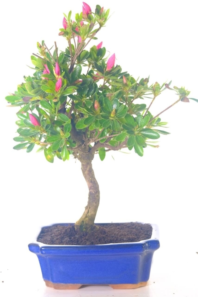 Introducing a magnificent Japanese Flowering Azalea Bonsai tree, known for its stunning pink blooms that flourishes in spring. Displayed in a sleek, new royal blue-coloured rectangular bonsai pot, to match any setting. This striking tree is a favourite in the bonsai community. Admired for its funnel-shaped flowers, the Japanese Azalea represents the uplifting message that “Everything will be better because of you!”