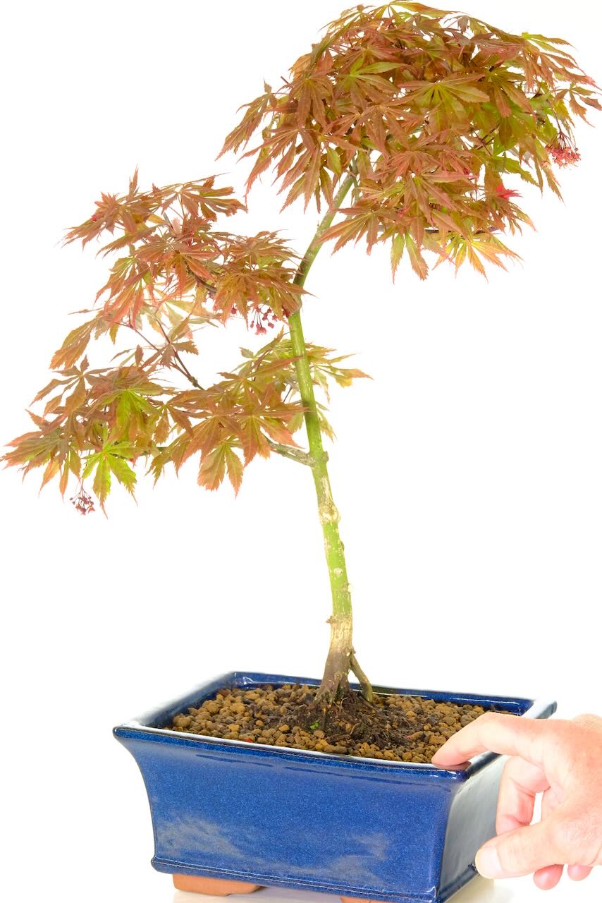 An aged Japanese red maple with spectacular red spring & autumn foliage colour, with Excellent Trunk Flow and Colourful Canopy. Beautiful root flare. Very pretty – An all time bonsai favourite. An elegant stature with very pretty scarlet stems.