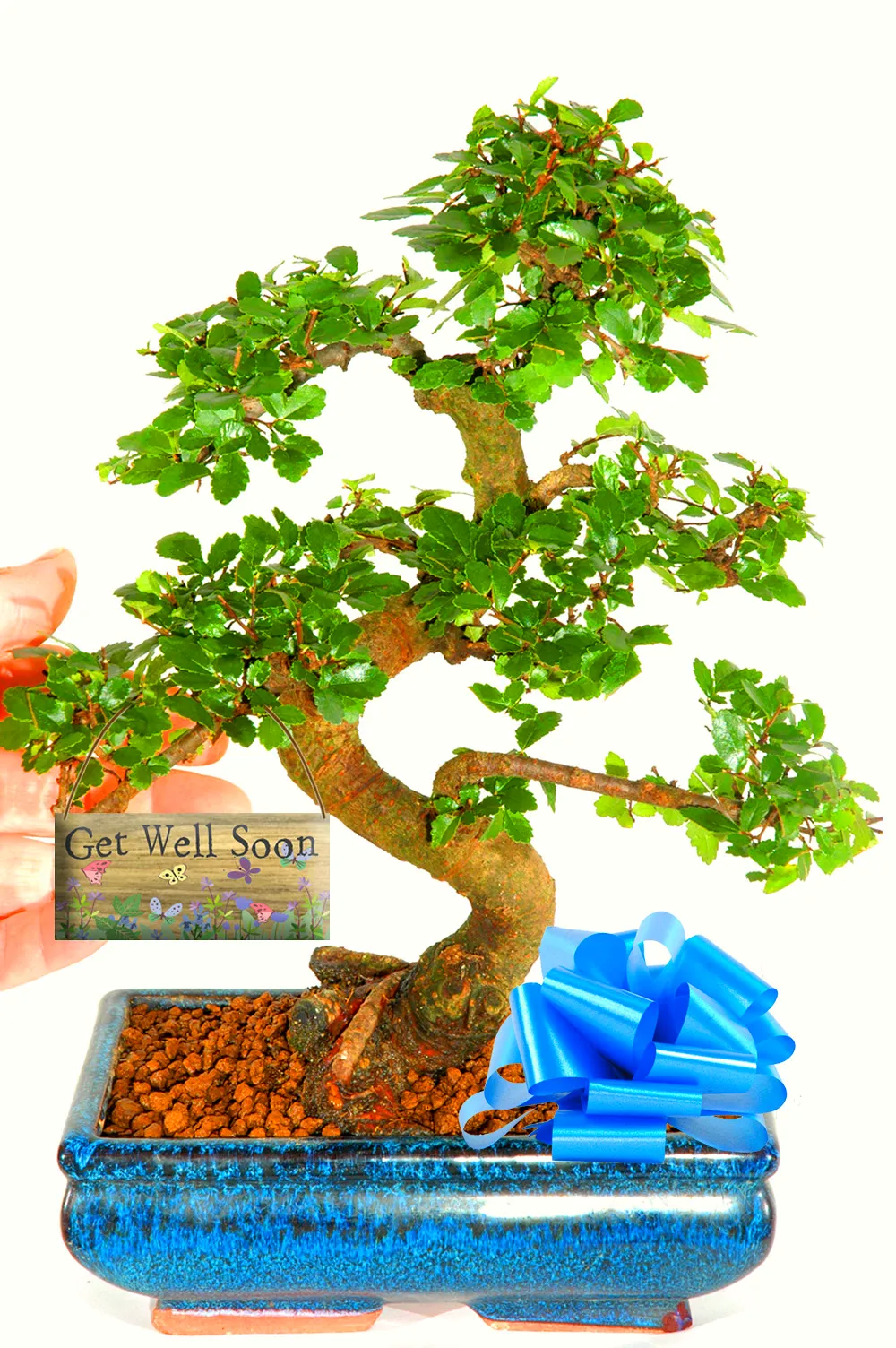 This larger 12-year-old Chinese Elm bonsai makes a thoughtful get well gift for both women and men, offering calm beauty and lasting meaning. With its sweeping trunk, neat evergreen foliage, and butterfly “Get Well Soon” wooden tag, it brings gentle encouragement and elegance into the home. Easy to care for and supplied with a drip tray and care guide, it’s a reassuring, long-lasting alternative to cut flowers, delivered free to most UK addresses.