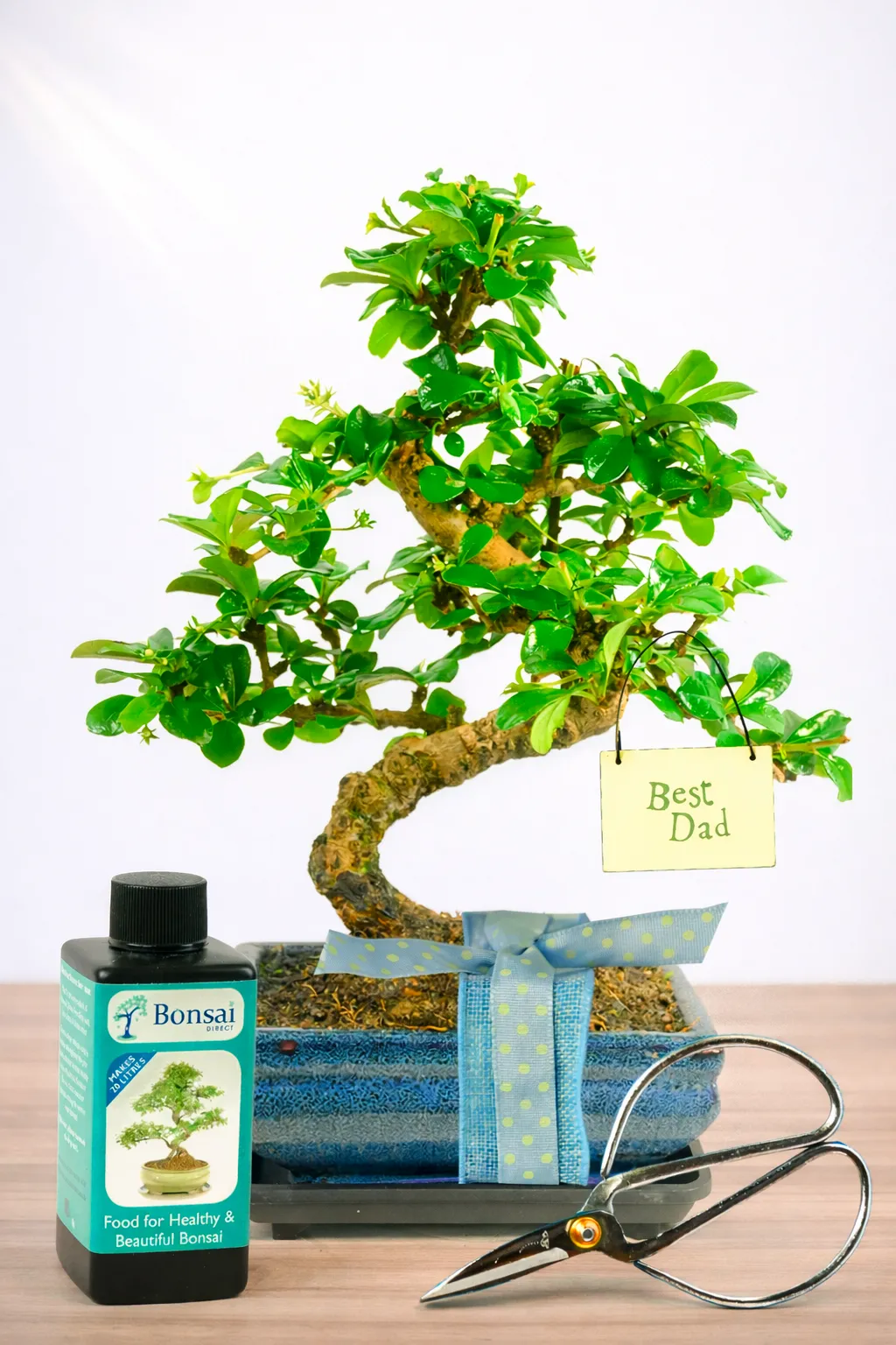 To make this Father’s Day bonsai extra special, we include a pair of pruning scissors and a bottle of bonsai feed. As a result, Dad receives not just a tree, but everything he needs to enjoy it from day one. Finally, we wrap the gift in blue jute and ribbon and add a “Best Dad” tag, creating a polished, ready-to-present finish.