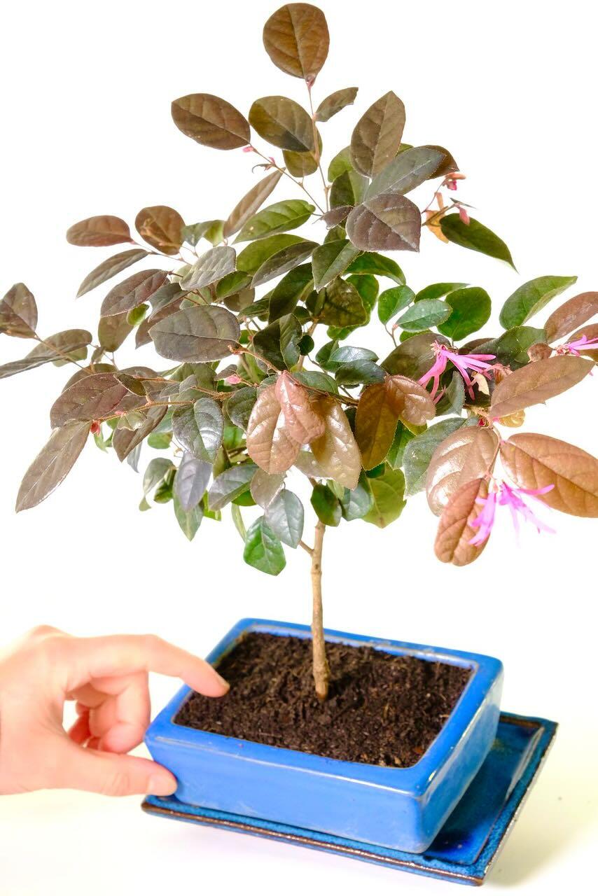 This young bonsai is a joy to grow and care for, combining low-maintenance qualities with striking seasonal displays. In the warmer months, you’ll enjoy vivid hot pink, fringe-like flowers that contrast beautifully with the rich, purple-tinted foliage. New shoots emerge in fresh shades of pink, adding energy and depth to its canopy throughout the growing season. As I write this in July 2025, it has striking flowers!