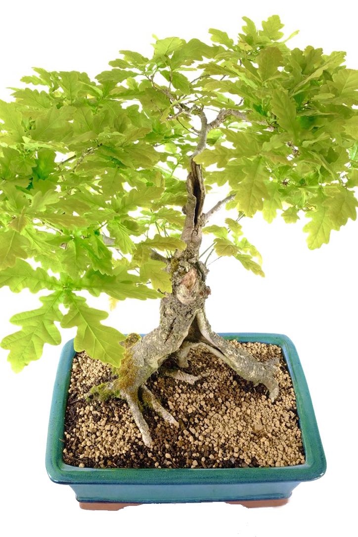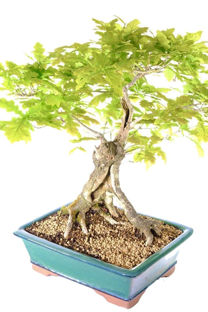 The fresh, bright green lobed leaves of this bonsai create a striking contrast against its phenomenal root exposure, adding to its powerful presence. Presented in a forest green ceramic pot, this English Oak bonsai exudes a commanding presence and a strong stature, making it an ideal gift for anyone.