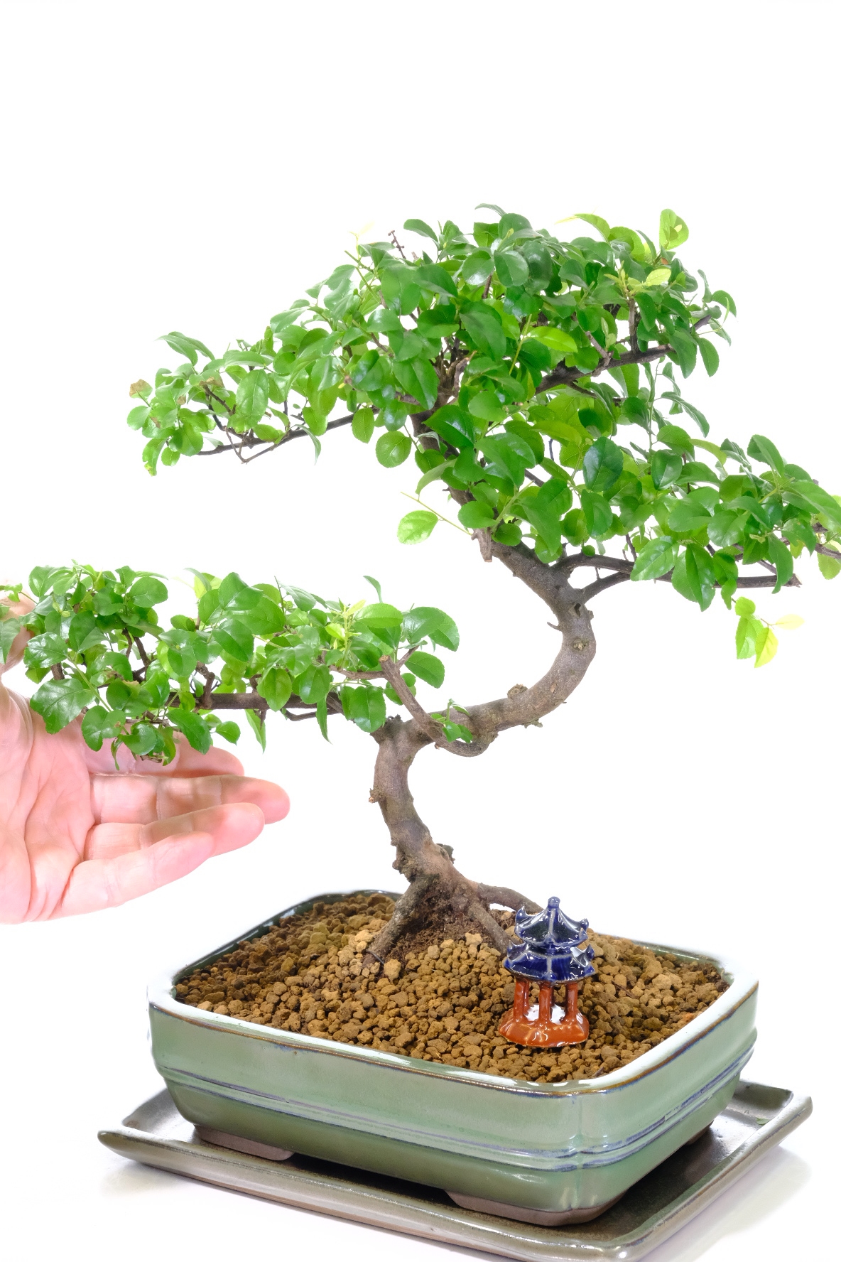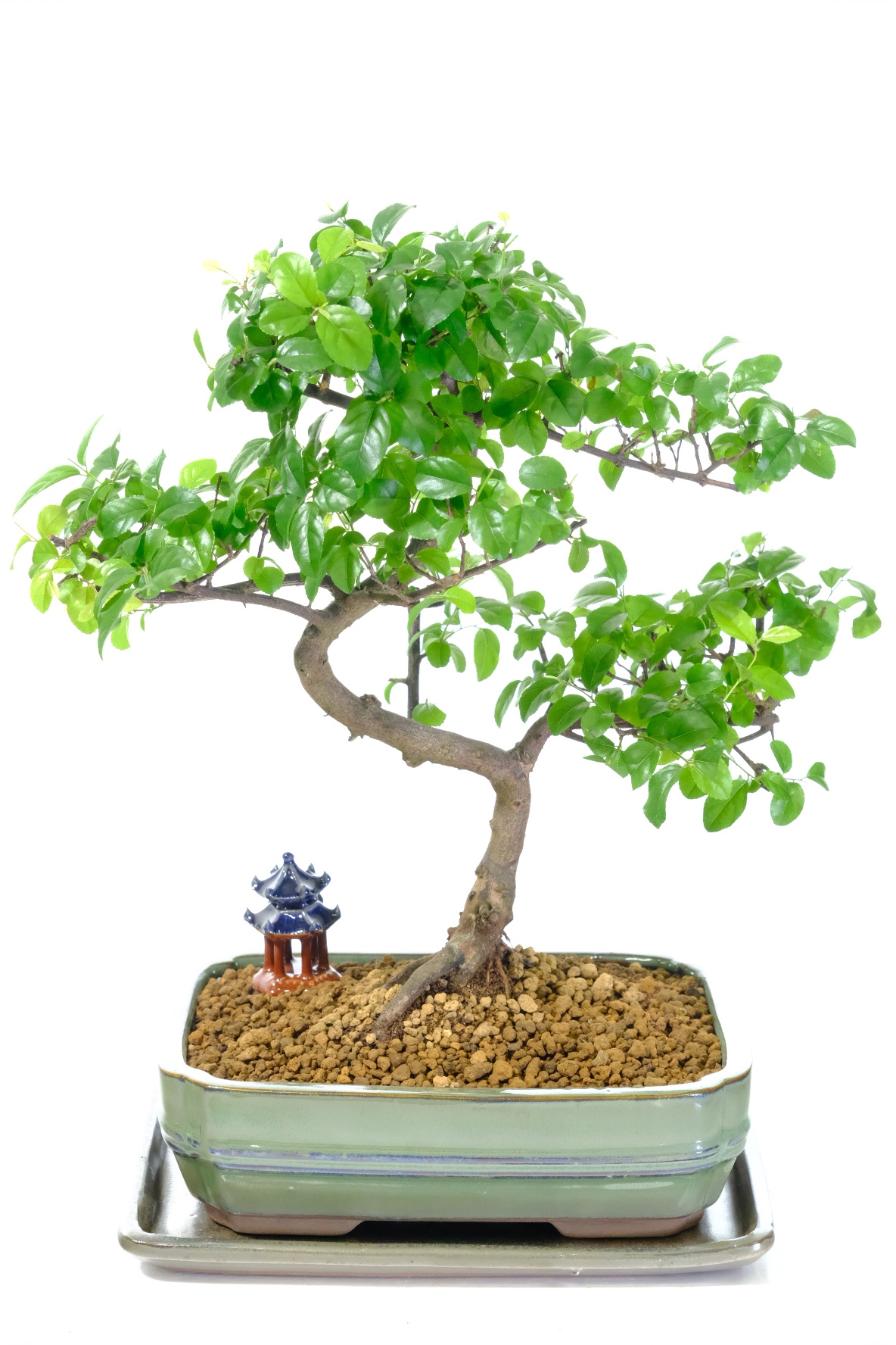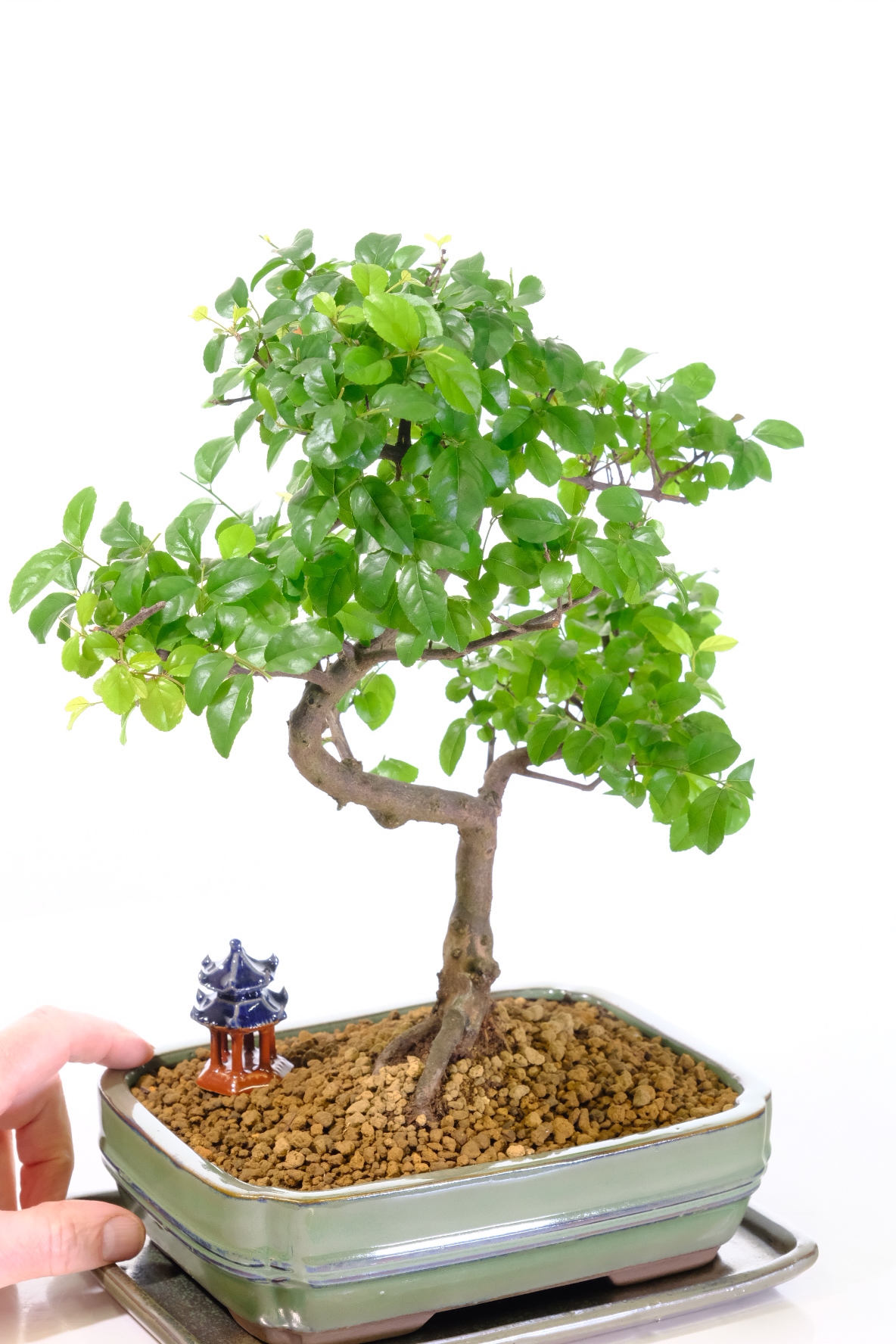 A stunning twisty Sageretia theezans Chinese Sweet Plum bonsai from our Premium Collection. This elegant tree features a beautifully twisting trunk, textured bark, and perfectly spaced branches supporting a lush canopy of light green leaves. During summer, it produces small purple fruits, adding a delightful seasonal feature. Planted in a sage green ceramic bonsai pot with a matching ceramic drip tray and lovely blue-roofed temple, it arrives ready to display. Easy to care for and fun for beginners, this bonsai is perfect for anyone starting their bonsai journey. This is the exact tree you will receive, carefully selected by our expert family-run nursery.