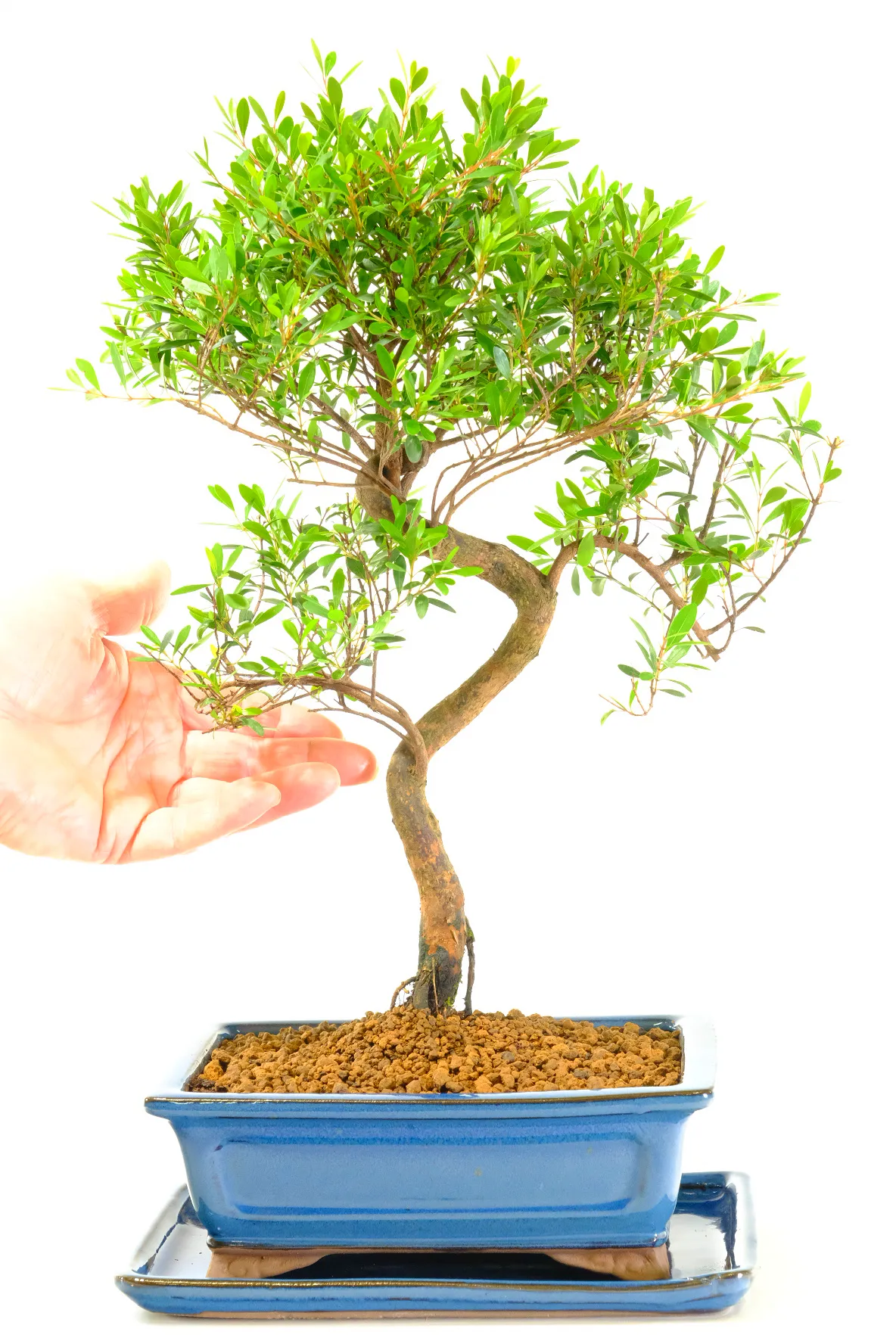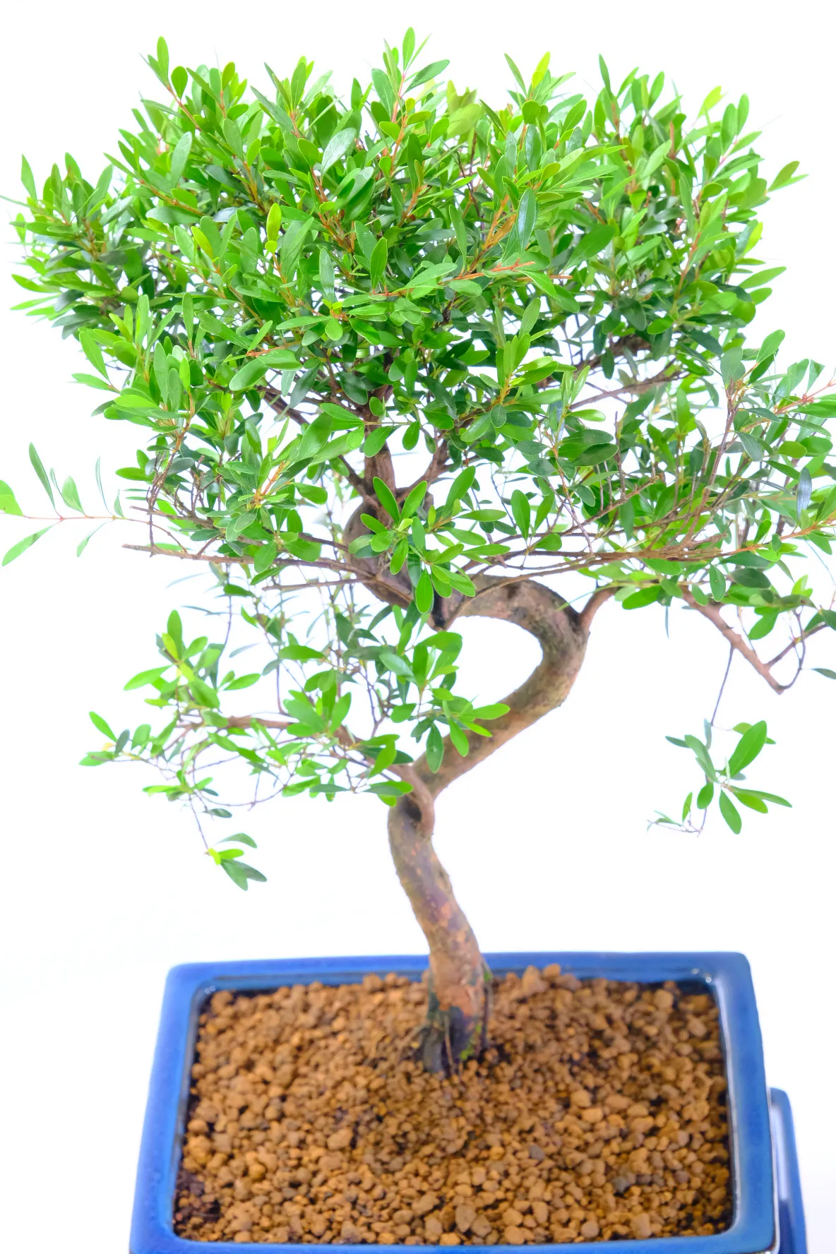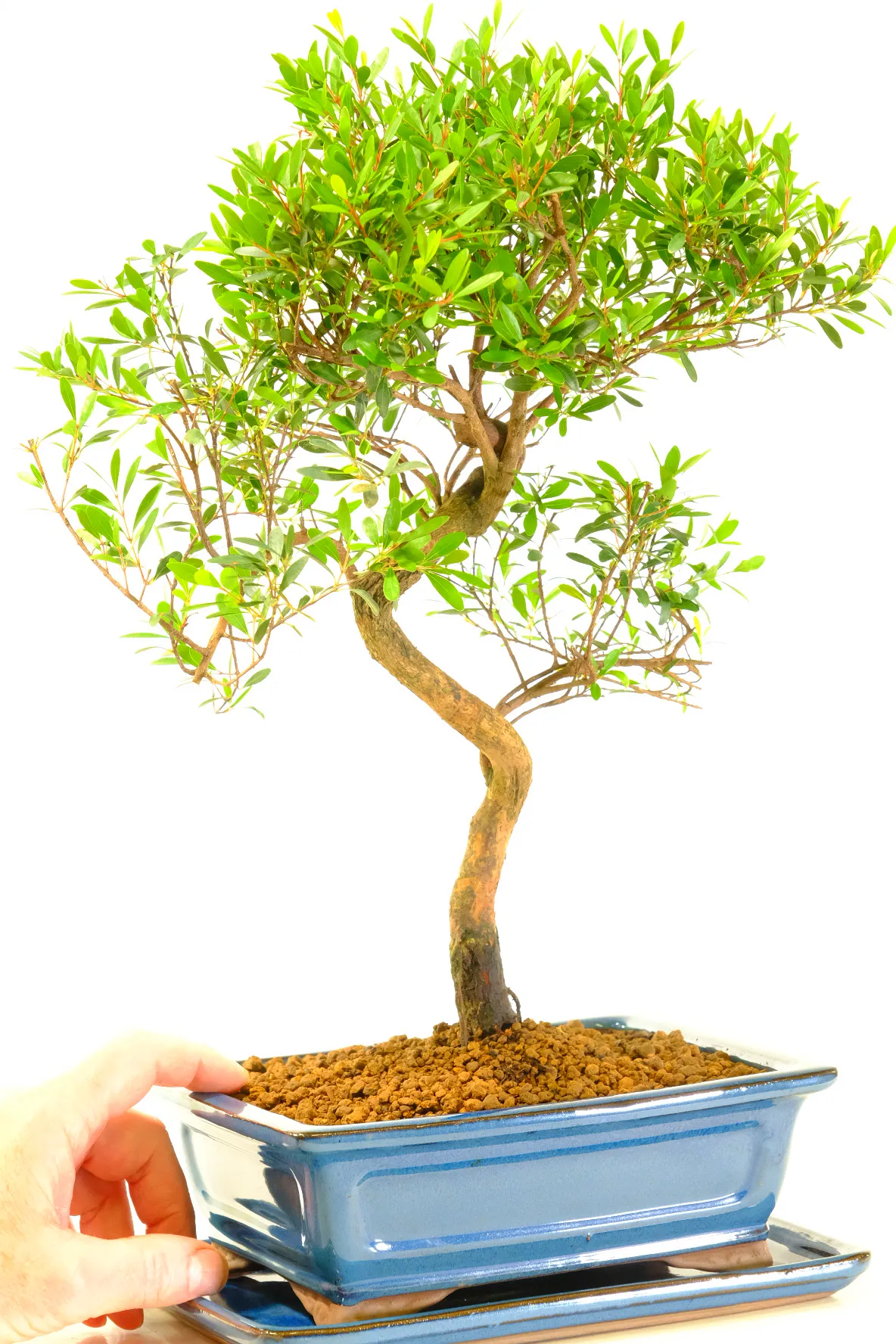 This striking twisted Syzygium bonsai is full of character and movement. The trunk curves and turns with natural confidence, creating a sculptural silhouette that draws the eye from every angle. Its beautiful branch structure spreads evenly, forming a balanced canopy that looks refined yet organic.