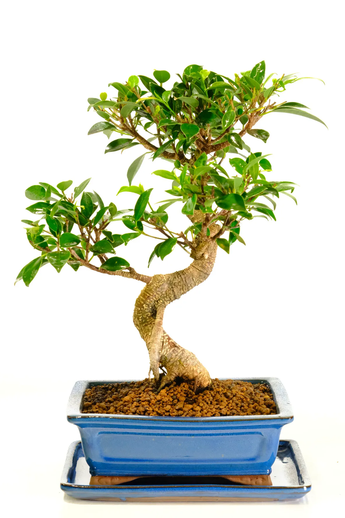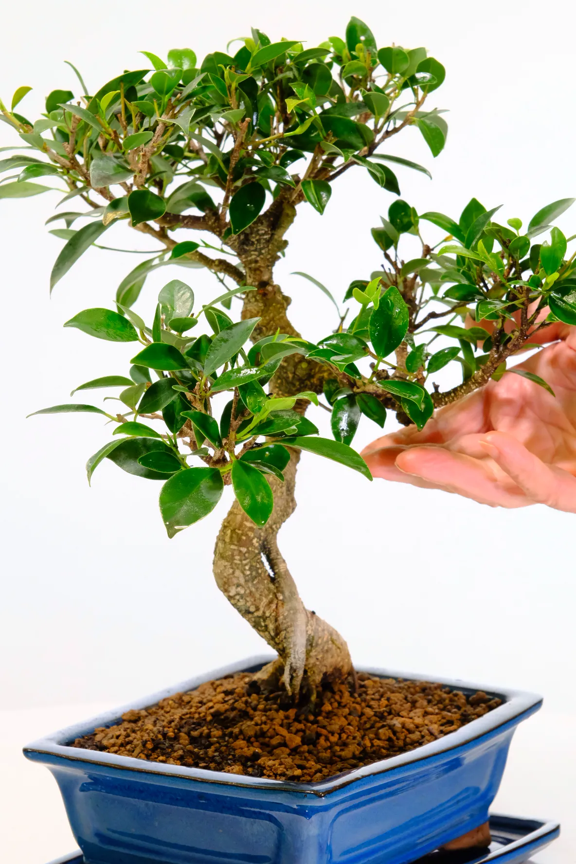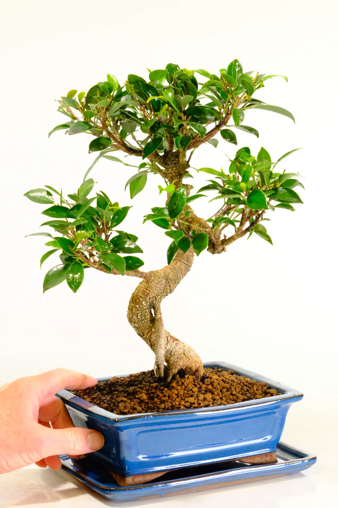 Beautifully sculptural and wonderfully low maintenance, this easy care bonsai (Ficus retusa) features a twisty trunk with elegant natural curves, textured bark with fine striations, and large glossy green leaves. A truly beautiful easy care bonsai that symbolises health and love. Planted in a striking blue rectangular pot with a matching ceramic drip tray, this is the exact tree you will receive — carefully shaped and sustainably grown by our experienced family team at Bonsai Direct.