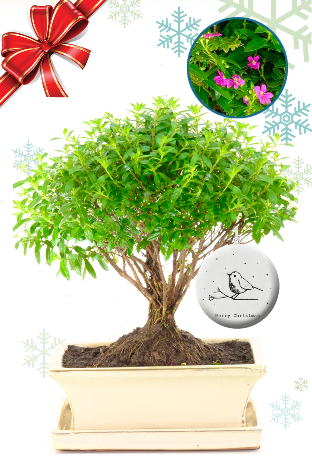 Your Cuphea bonsai arrives in a stylish cream ceramic pot with a matching drip tray. A flat porcelain “Merry Christmas” bauble hangs from the branches, featuring a robin motif and festive fir sprigs. This keepsake decoration adds instant seasonal charm.
