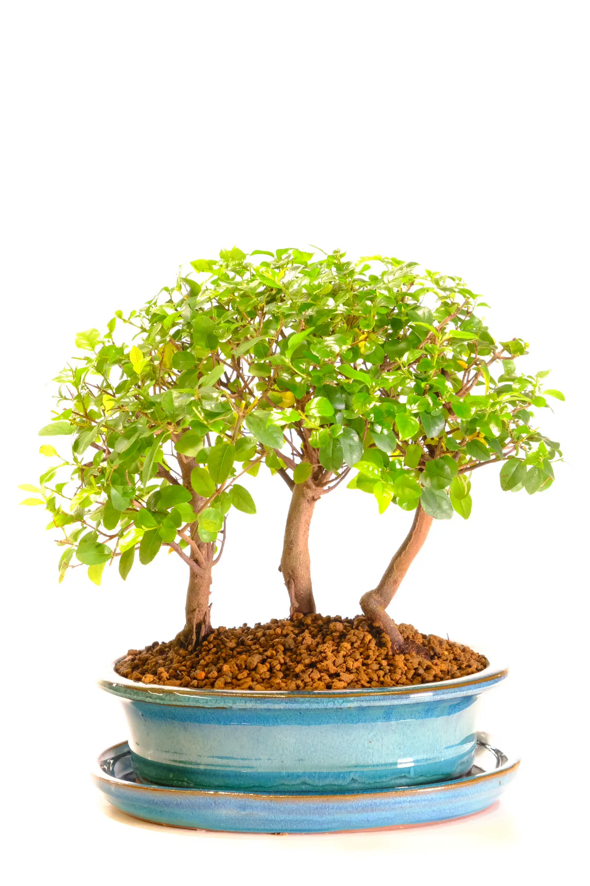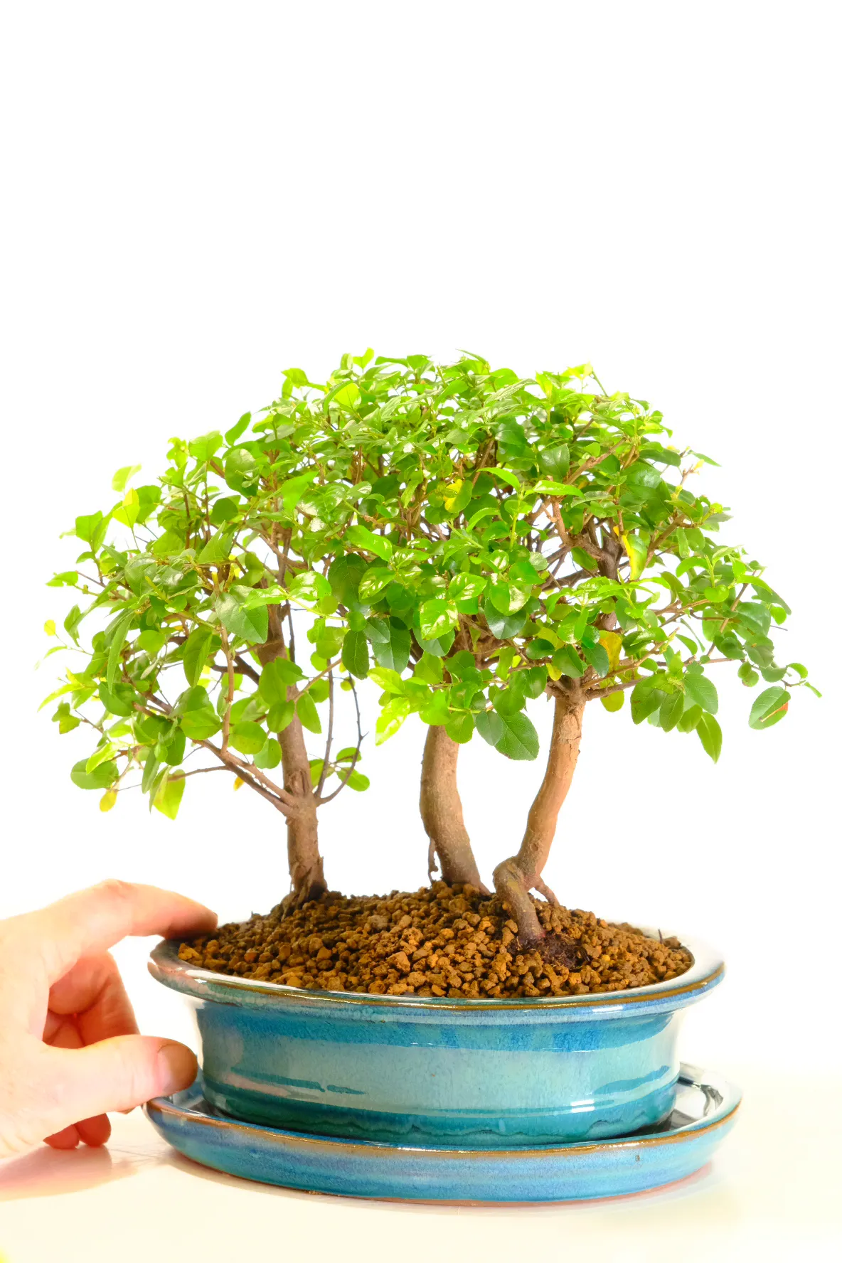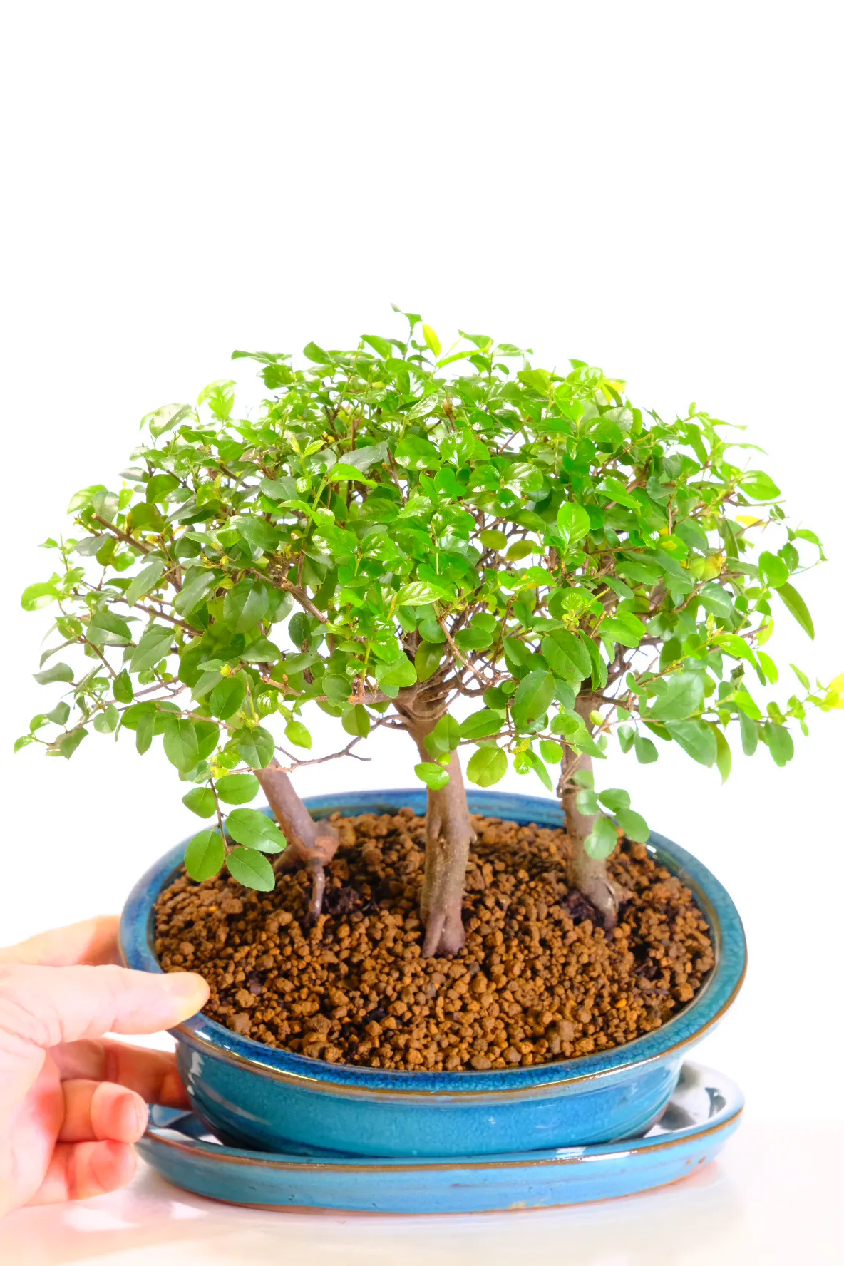 This premium Sweet Plum Indoor Bonsai Forest is a beautifully composed miniature woodland, crafted from three informal-upright Sageretia theezans trunks. Individually photographed, it showcases graceful movement, natural balance and glossy foliage that shifts through warm seasonal tones. As it matures, the forest may produce tiny purple plum-like fruits, adding extra charm and interest. Presented in a teal blue ceramic pot with matching tray, this elegant forest makes a meaningful indoor feature for nature lovers. Styled by hand at our family-run Devon nursery, it offers timeless tranquillity and exceptional quality.
