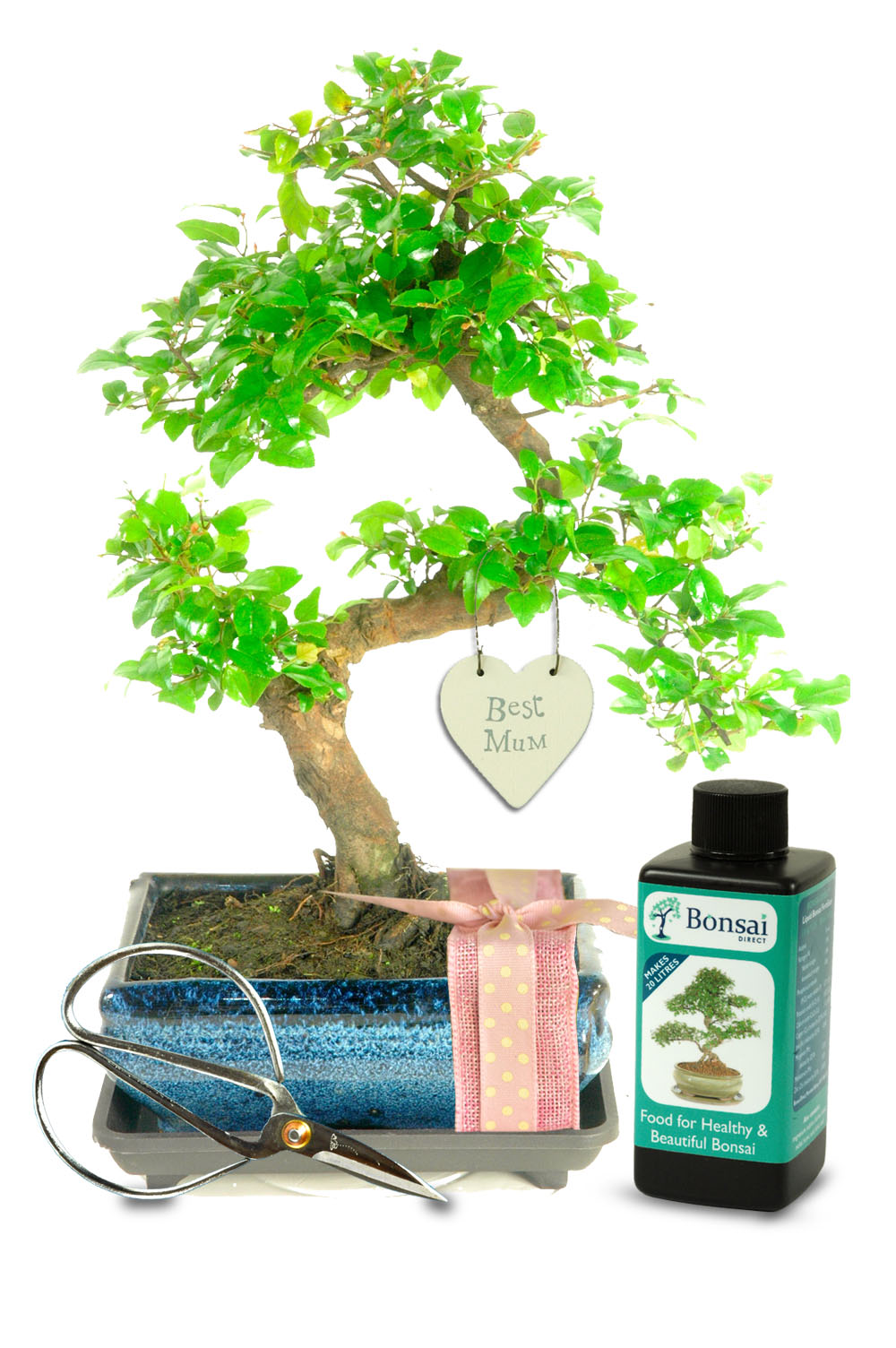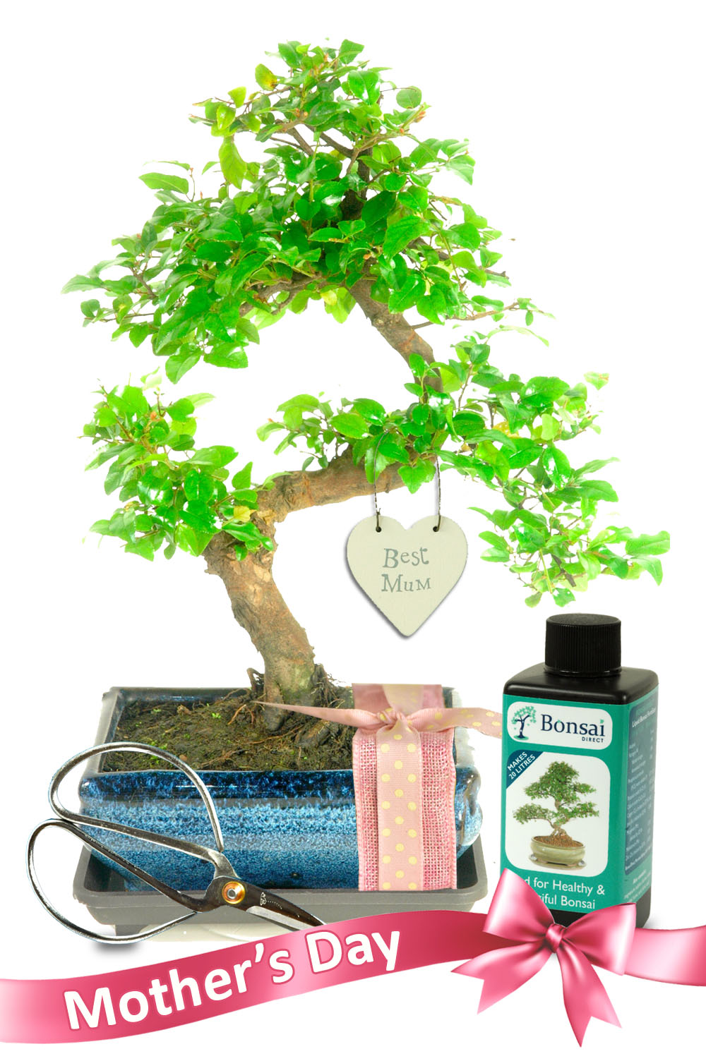 Make this Mother’s Day unforgettable with our inspired choice. Show your mum how much she means to you! The Chinese Sweet Plum, a fruiting bonsai ideal for beginners, features a twisty trunk, red-toned bark, and fresh green leaves. In summer, the foliage tips transform to a lovely russet tone, and as the tree matures, small purple plum-like fruits appear during warmer months. This 8-year-old bonsai comes in a navy blue ceramic pot with a dark-coloured drip tray. The gift set includes pruning scissors and fertiliser. We have enhanced the gift with a “Best Mum” hanging heart-shaped wooden tag, beautifully presented in pink jute and ribbon. Need a last-minute gift? Enjoy Mother’s Day delivery!