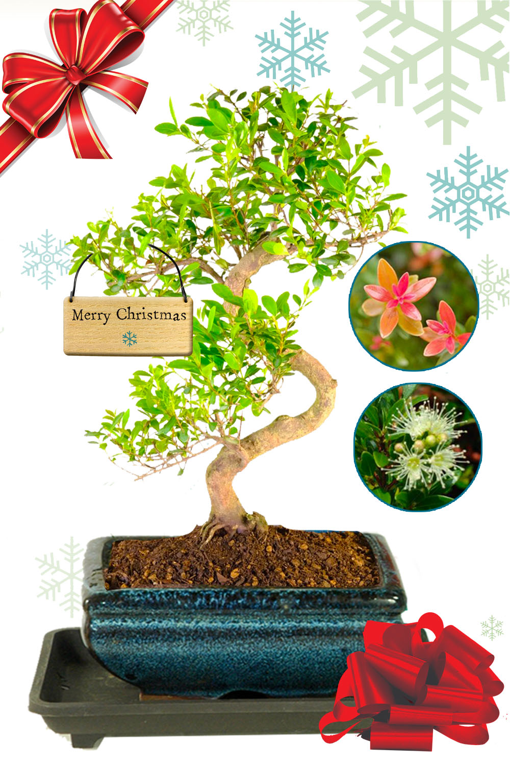 This beautiful 12-year-old Syzygium buxifolium bonsai—often called the Roseapple or Myrtle—brings elegance, colour, and natural joy into the home at Christmas. Its sculpted trunk, warm red-toned bark, and dainty leaf proportions create a wonderfully artistic miniature tree that suits beginners and plant lovers alike. Potted in a blue ceramic pot with a dark-coloured drip tray, it offers a striking festive display. A classic “Merry Christmas” wooden tag completes the gift with a thoughtful seasonal touch.