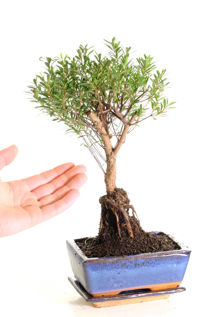 Discover miniature elegance with this exceptional flowering and fruiting bonsai tree, featuring a beautifully matured Myrtle bonsai, also known as Roseapple or Syzygium buxifolium. This is the exact bonsai you will receive—carefully nurtured over seven years to develop strong character, refined structure, and natural artistic presence.