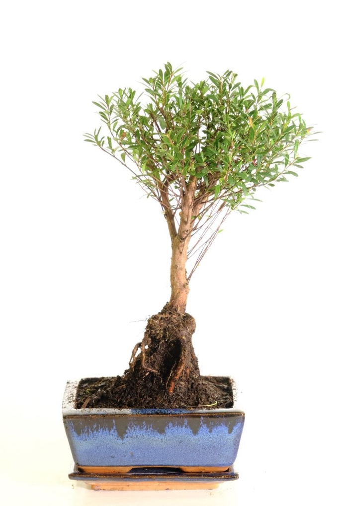 This indoor bonsai delights with both flowering and fruiting interest. During summer, it produces soft ivory flowers, followed by small cherry-like fruits in autumn. The informal upright trunk shows attractive red-toned bark, while the naturally miniature leaves form a dense, twiggy canopy. As the warmer months arrive, the foliage develops subtle red-tipped new growth, adding seasonal colour and depth.
