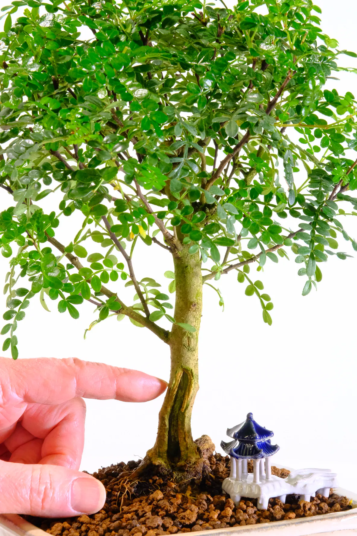This delightful 8–year-old Pepper Bonsai (Zanthoxylum piperitum) is a tree that truly engages the senses — beautiful to look at, easy to care for, and wonderfully fragrant. It features a lovely even canopy of naturally small, glossy green leaves, which release a fresh, zesty citrus fragrance when pruned or brushed. The light, spicy aroma gives this bonsai a lively and refreshing presence — it’s like a breath of nature indoors. This particular specimen is beautifully styled, with an elegant trunk and refined branch structure that supports its soft, rounded canopy. The composition is full of charm, featuring a glazed oriental temple which makes it a joy to display. Potted into a brand new ivory/cream glazed ceramic bonsai pot with matching drip tray to sit beneath the pot, this tree feels fresh, modern, and full of character. The matching drip tray completes the look, creating a polished and thoughtful design that complements the tree’s natural beauty perfectly.