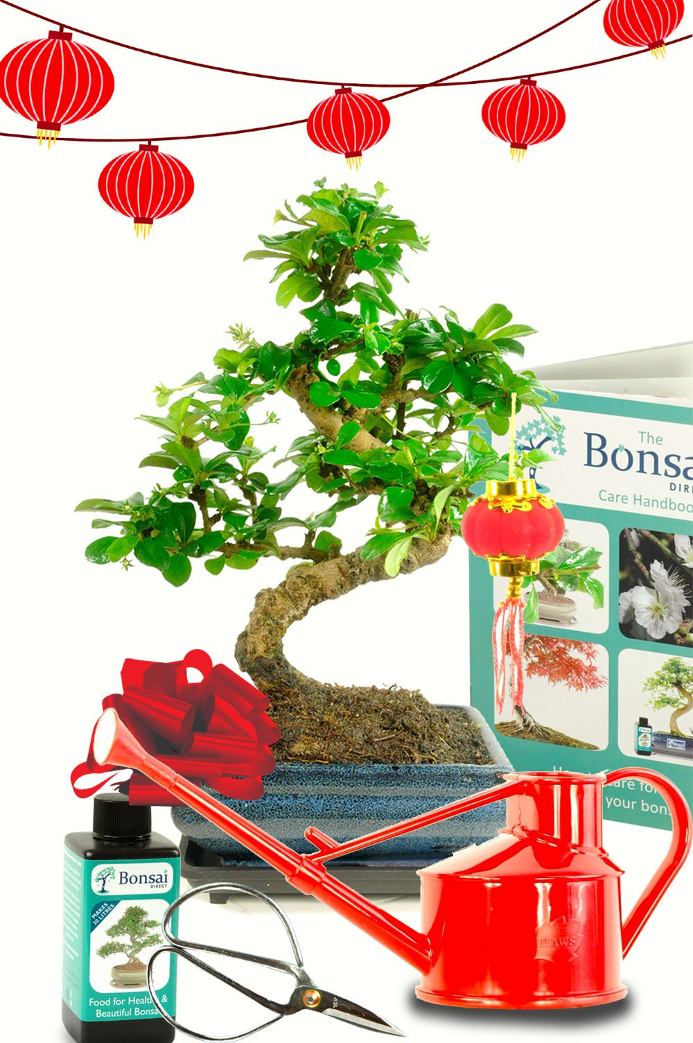 The kit also includes everything needed to care for the bonsai with confidence: bonsai fertiliser, pruning scissors, a Bonsai Direct care handbook, and a beautifully made 700ml midnight blue Haws watering can. To mark the occasion, a miniature red Chinese lantern adds a festive and cheerful finishing touch.