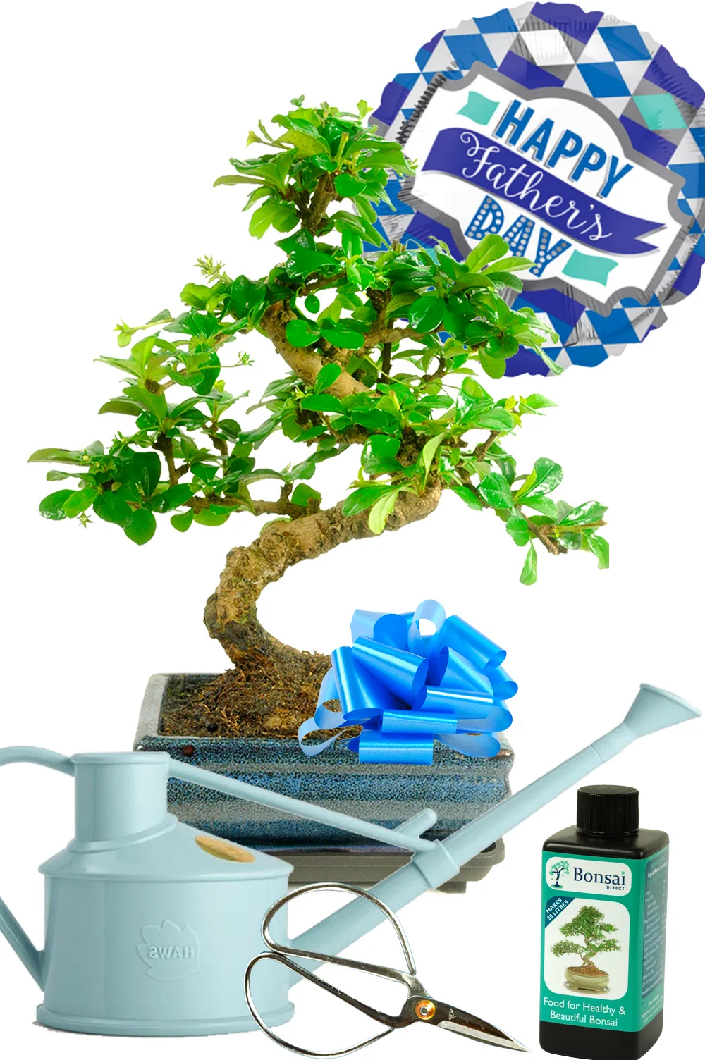 Introducing the ultimate Father’s Day bonsai gift! This exceptional flowering indoor bonsai kit comes complete with everything Dad needs for a blooming summer display. Don’t miss out on this sensational offer! Included in this stunning gift set is a charming mid sized 12 year old s-shaped flowering Fukien Tea Tree bonsai. This is an evergreen species and displays small star-shaped white blooms during the summer months. The bonsai is elegantly potted in a blue glazed ceramic pot, accompanied by a drip tray to catch any watering drips. But that’s not all – Dad will also receive bonsai pruning scissors, bonsai fertiliser, a comprehensive care handbook, and his choice of watering can. Plus, to add an extra special touch, we’ve included a Father’s Day foil balloon.