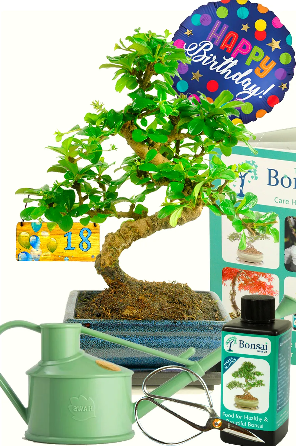 Celebrate a meaningful milestone birthday with this 12-year-old flowering Carmona bonsai in a navy ceramic pot, complete with a dark-coloured plastic drip tray. This charming bonsai has twisty movement, glossy leaves and delicate white blooms, making it a beautiful focal point for any room. The set includes scissors, fertiliser, a watering can (choose from 6 colours), a blue birthday balloon, and a wooden milestone age tag chosen from the dropdown. Grown with care on our eco-conscious family nursery, this keepsake gift offers lasting charm and thoughtful symbolism for any special birthday.