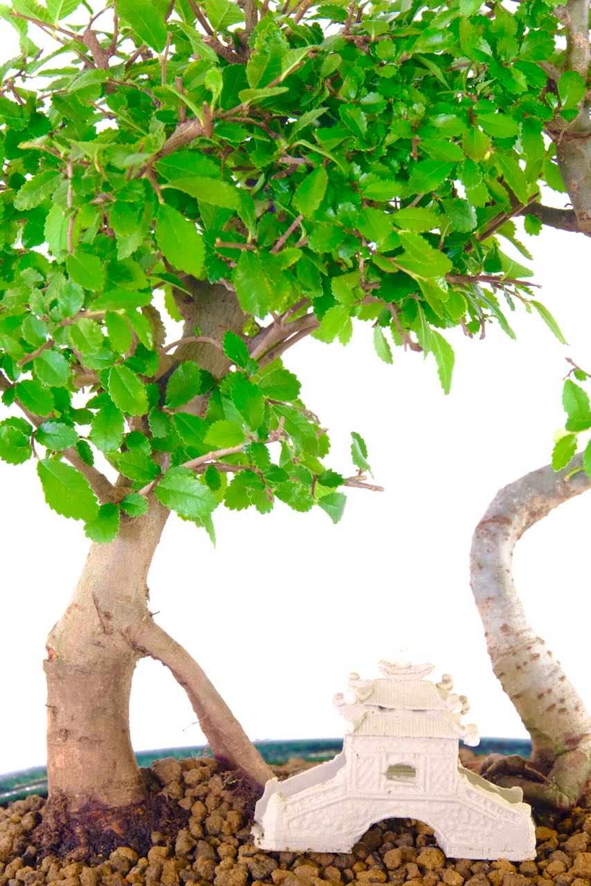 EXCELLENCE RANGE Aesthetically pleasing twin Chinese Elm bonsai arrangement which displays textured shapely trunks and phenomenal root flare. This bonsai style is called ‘Father & Son’. The larger ‘Father’ figure nestling close to the smaller tree. A very beautiful composition which is fun to grow & style. This bonsai would make a wonderful Father’s Day Gift for a special dad who appreciates nature or an eco friendly gift. Supplied with a tasteful ornamental bridge.