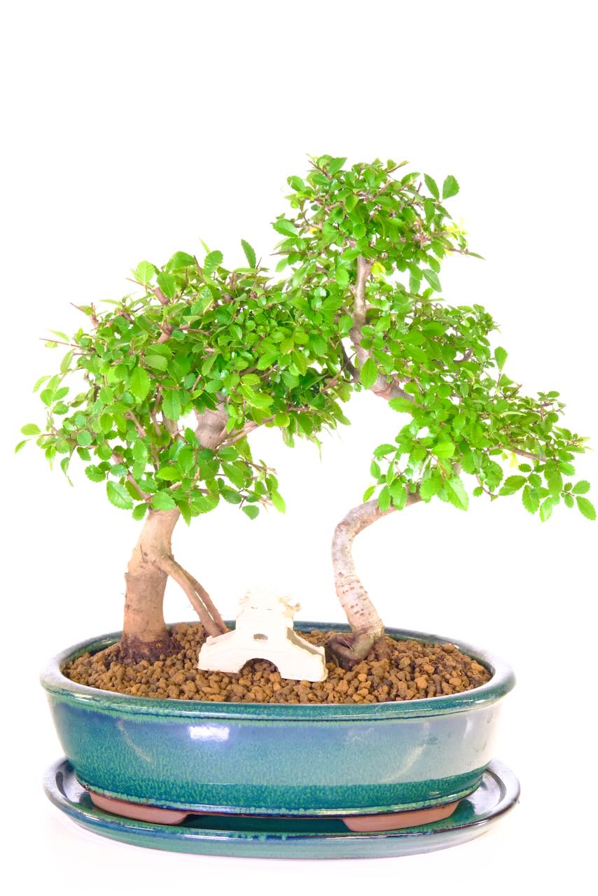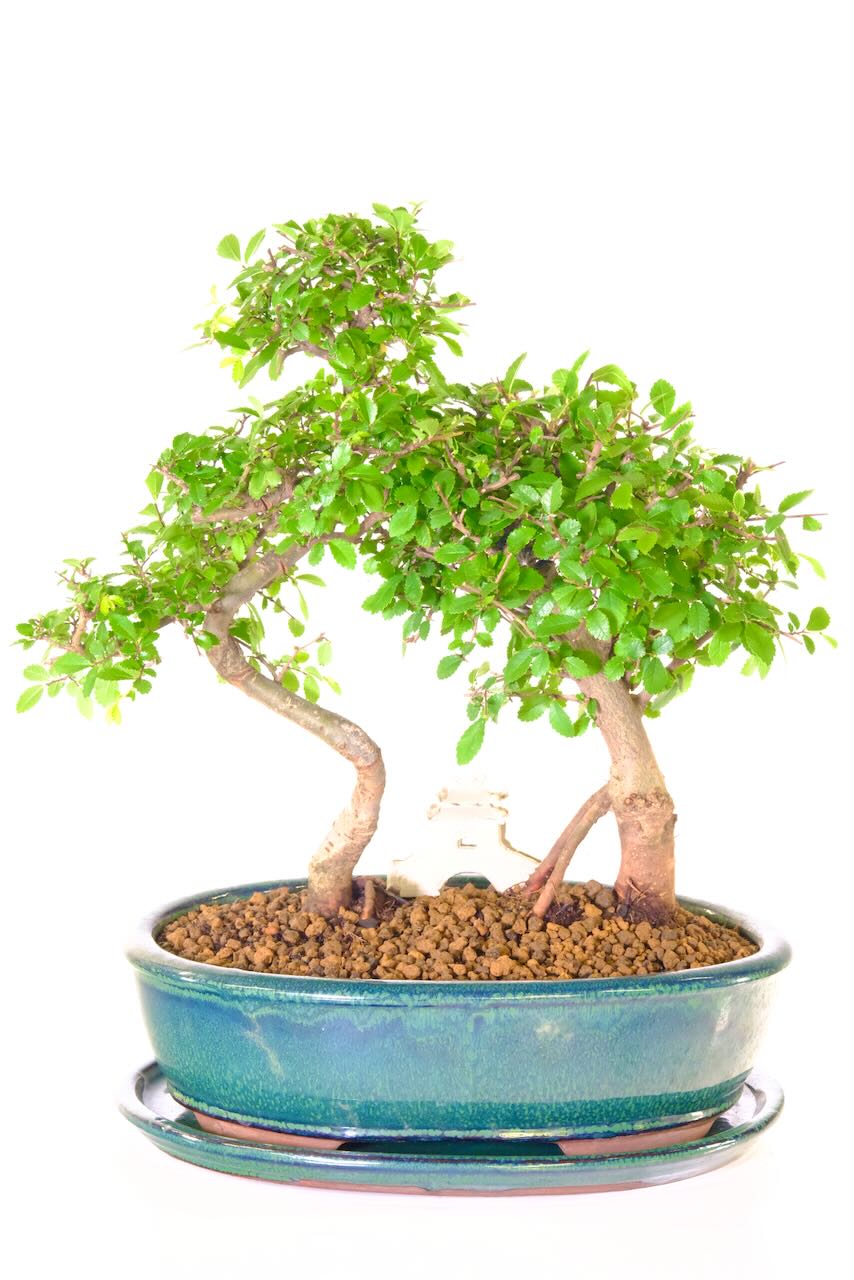 Comes potted in a forest green ceramic bonsai pot with matching drip tray. The colouring of the pot compliments the fresh green foliage.