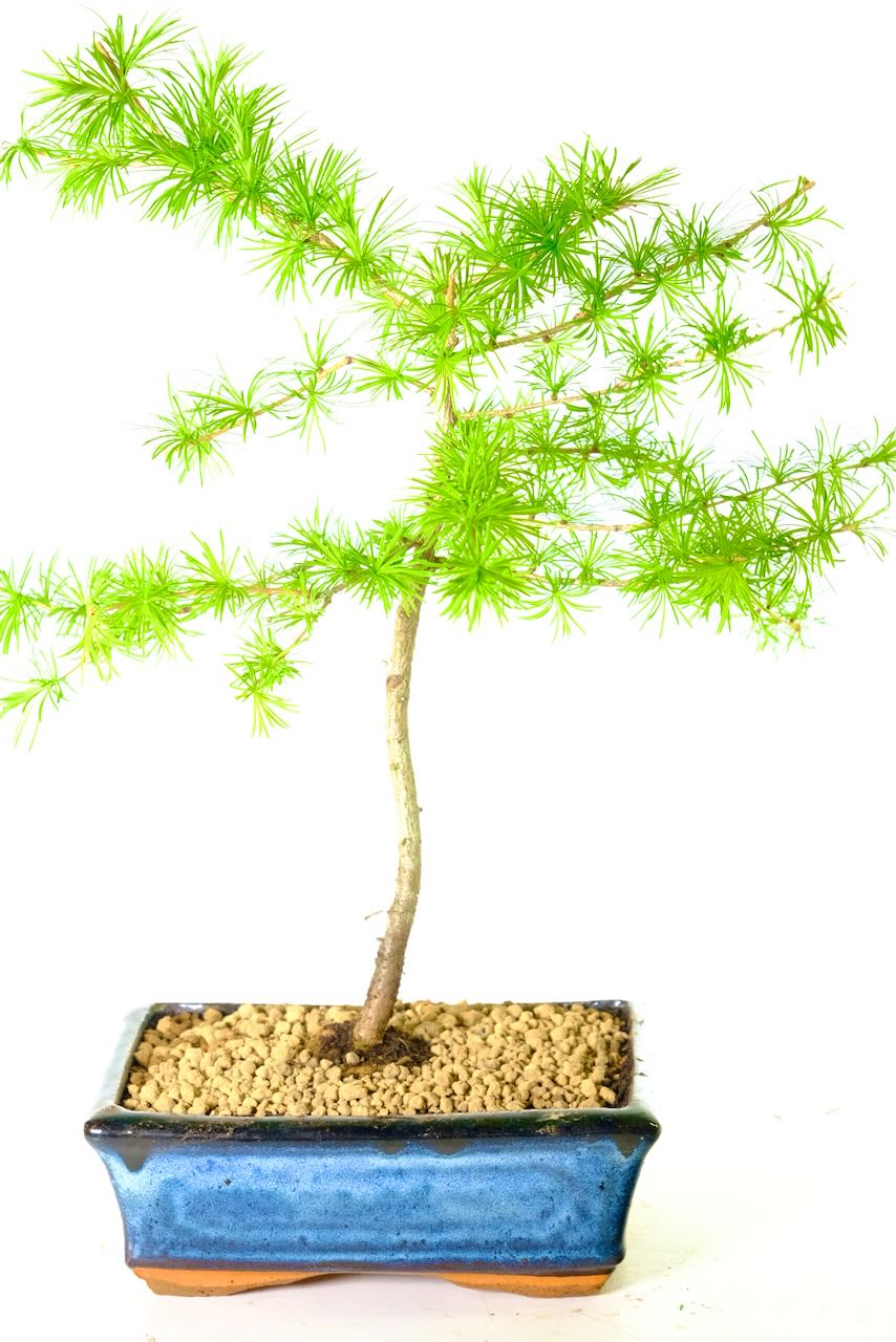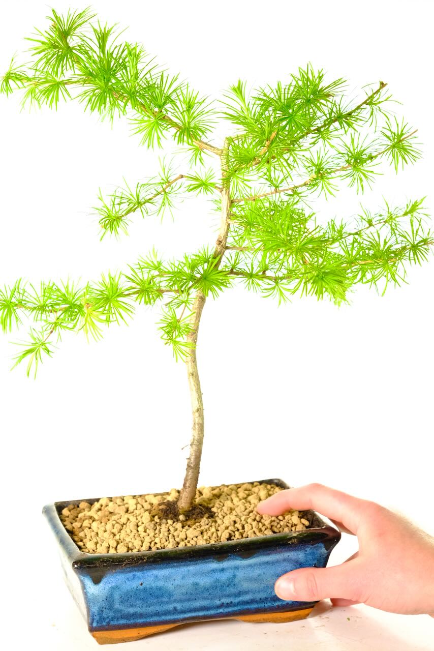 We do not claim that this is a fully grown bonsai. This little tree has been pre-styled to give gentle movement in the trunk. The trunk is still pliable enough for you to wire and the branches are also flexible. This allows you to have a go and develop your own shape and style. The little larch is a black canvas. It’s the perfect starting point.