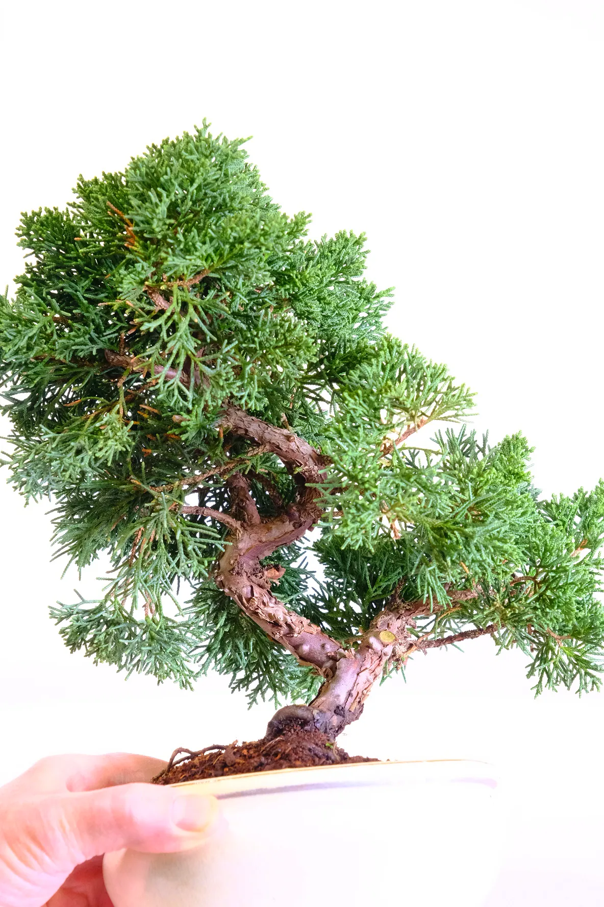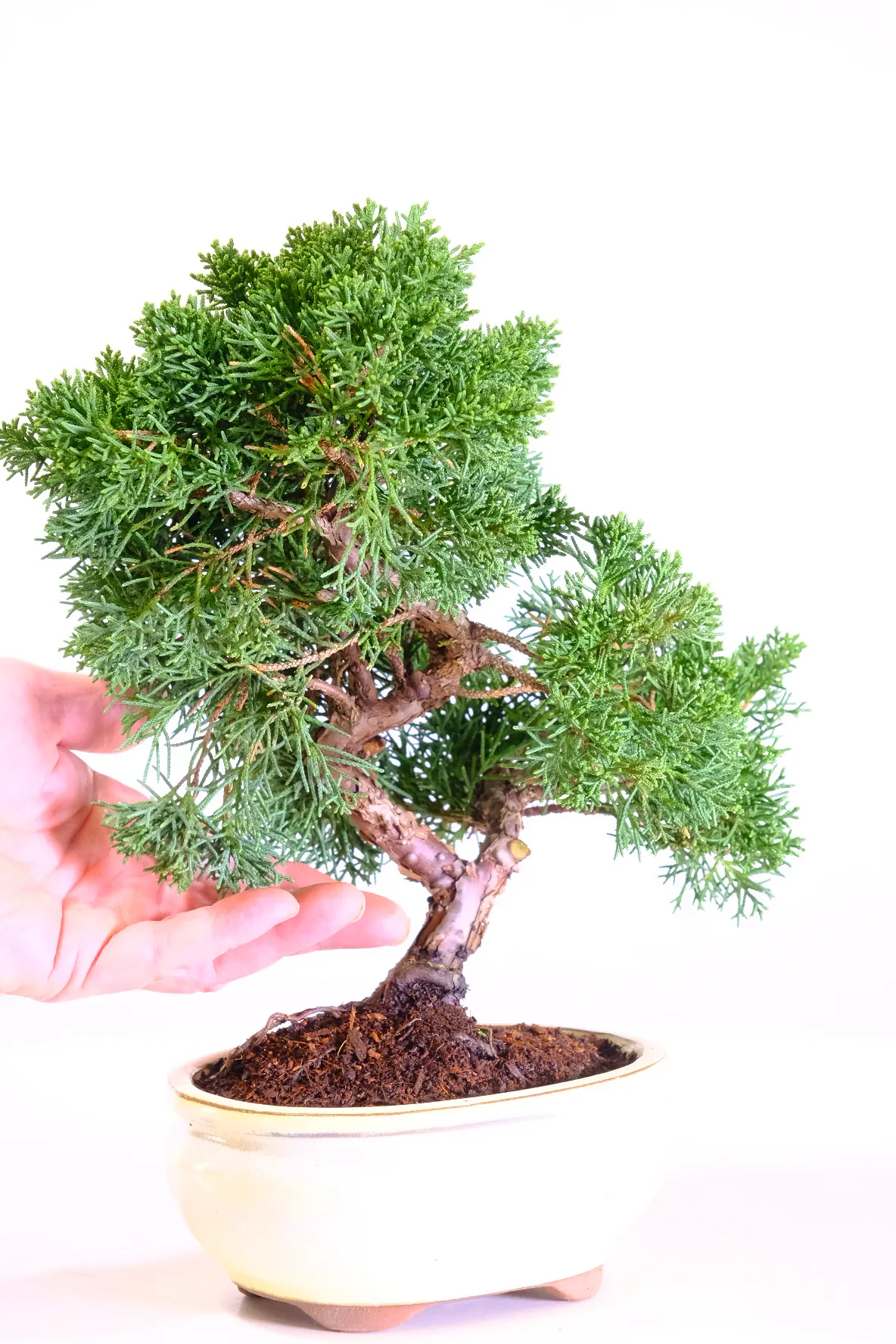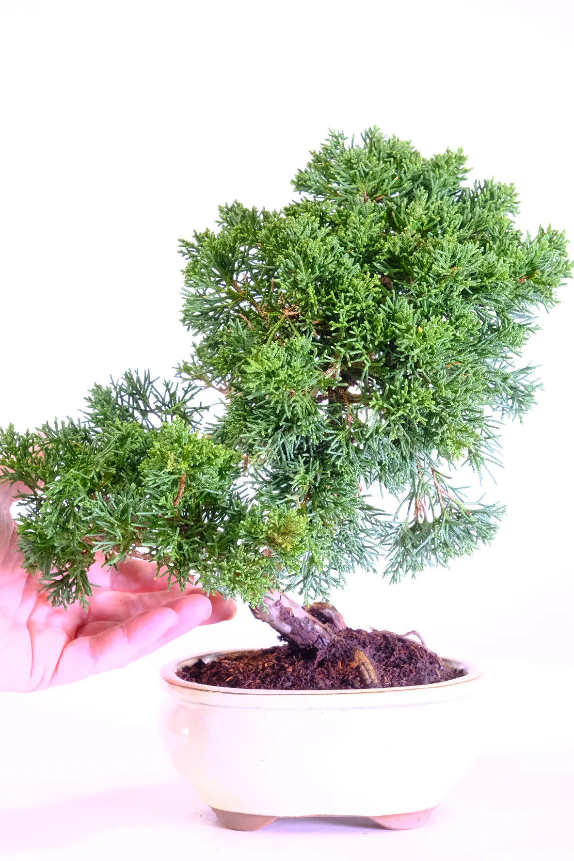 This 13-year-old Chinese Juniper bonsai stands 35cm tall and showcases sensational twisting trunk movement with strong exposed roots and mature reddish flaky bark that reflects genuine age. Soft evergreen foliage provides year-round structure and colour, creating a balanced and powerful composition. Potted into a brand-new cream oval ceramic bonsai pot, it offers a refined, elegant finish that beautifully complements the rich trunk tones and deep green foliage. This is the exact bonsai you will receive.