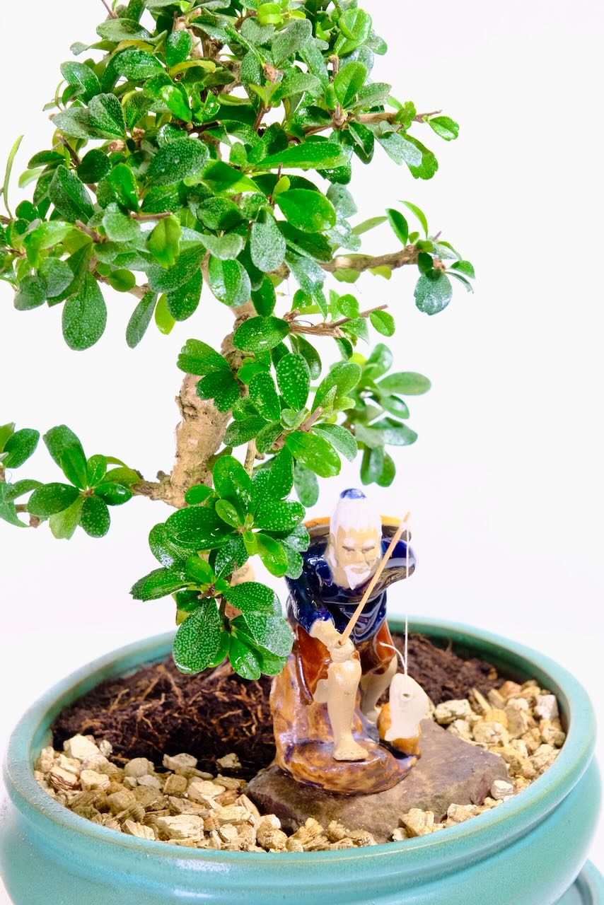 The Fukien Tea originates from Southeast Asia and thrives in warm, bright indoor rooms. It stays compact and develops fine branching, which makes it ideal for beginners. Furthermore, it produces delicate white blooms during the warmer months. These flowers last only a short time, yet they appear repeatedly. The species responds well to gentle pruning and suits anyone wanting a forgiving but elegant bonsai. Symbolically, it represents calmness, devotion and thoughtful contemplation, making it perfect for this riverside fisherman scene.