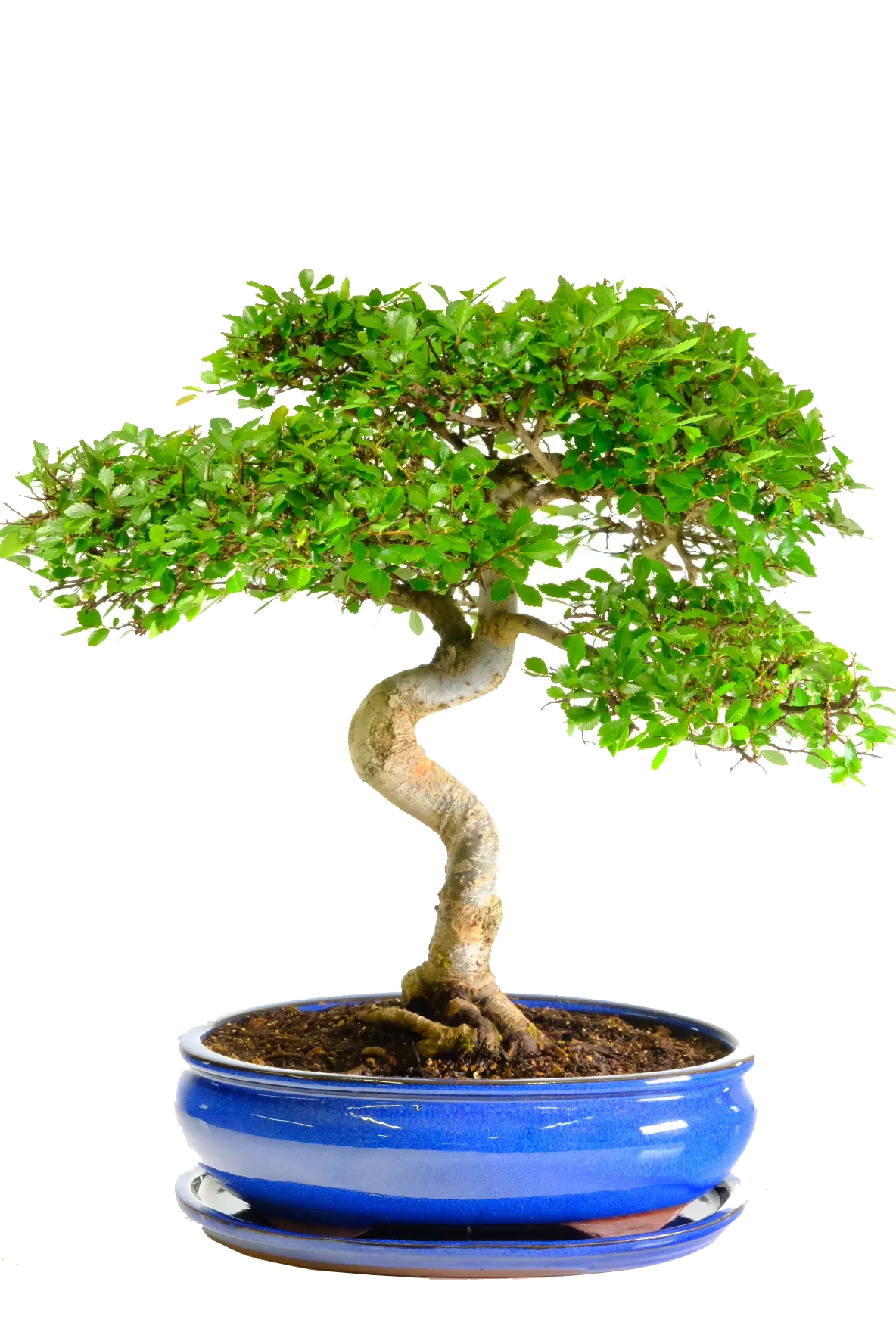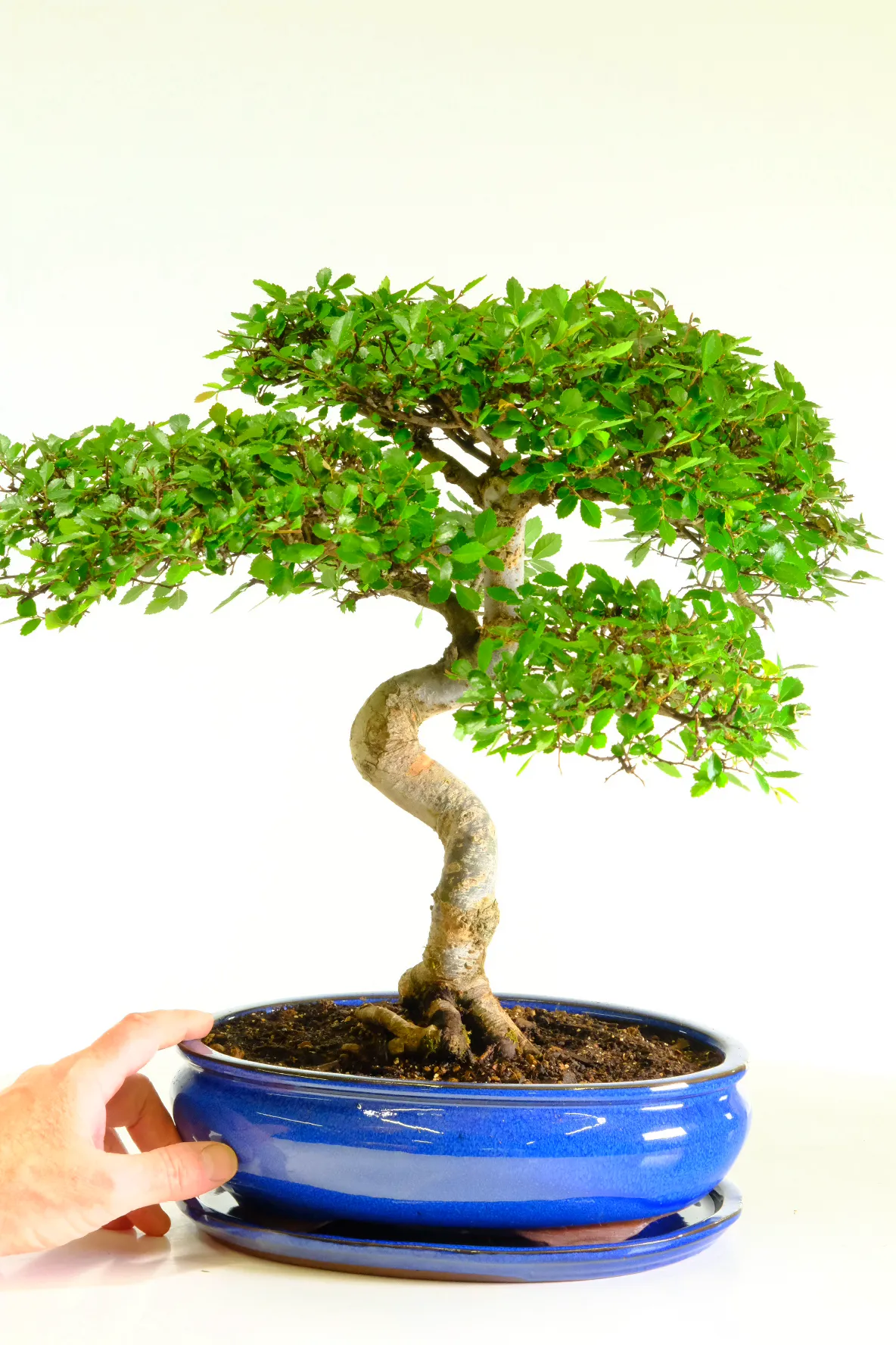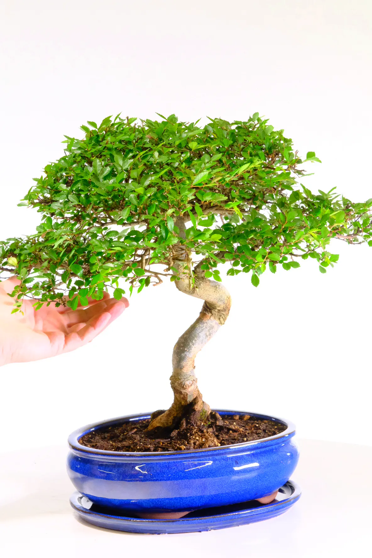 Experience the elegance of this 21-year-old Chinese Elm bonsai tree (Ulmus parvifolia), trained in the literati style. Its twisty trunk, exposed roots, and full, sculpted foliage pads create a stunning canopy. Potted in a royal blue oval bonsai pot with a matching ceramic drip tray, this Excellence range bonsai is a living sculpture you will receive exactly as pictured. A true bonsai beauty, grown on our Devon nursery by bonsai master Lloyd Noall.