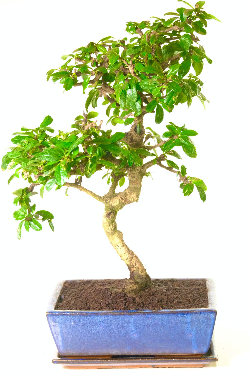 This is a large and impressive indoor bonsai tree. An evergreen delight with all year round foliage. Its form is extremely artistic. The trunk twists and undulates. It is strong and captivating. Potted tastefully into a classic blue ceramic bonsai pot with matching drip tray. The colour of the pot beautifully enhances the glossy emerald leaves and white summer blooms. A large bonsai at an outstanding price!