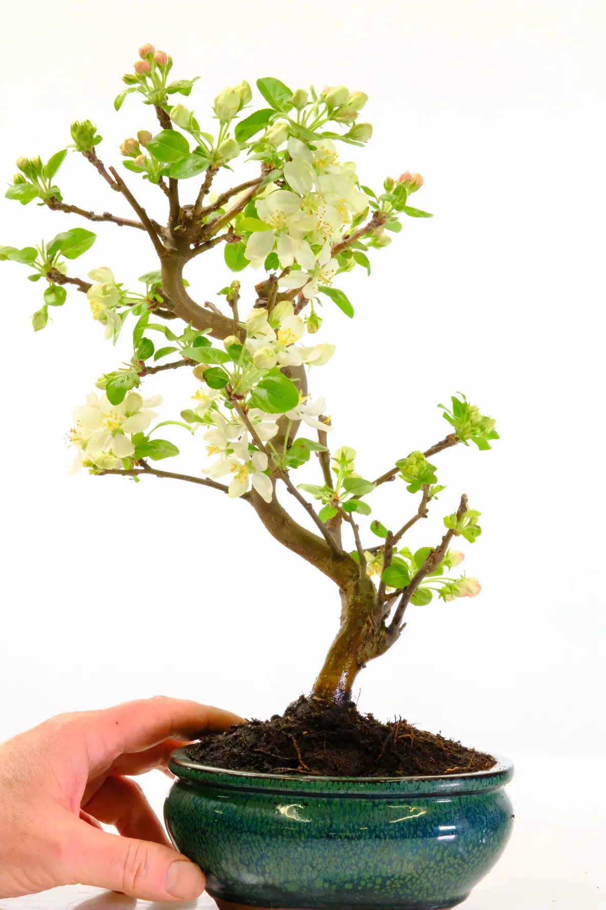 Sensational bonsai with stunning spring blossom and summer fruits – The crab apple (Malus sylvestris) has beautiful hot pink tinged white blossoms during spring followed by red fruits. A very pretty elegant twin trunk flow. An all time favourite – this elegant tree is extremely rewarding with sensational spring blooms and cheerful red ‘miniature apple fruits’ in mid summer.
