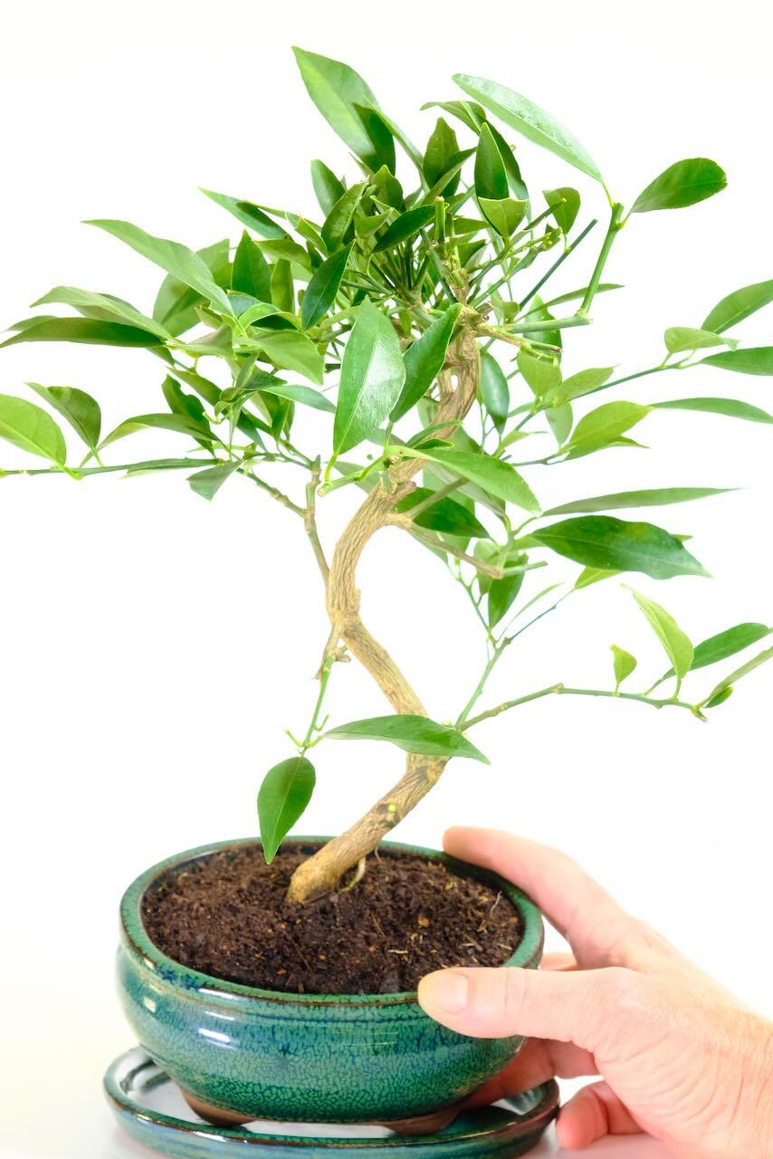This beautifully styled Citrus limonquat bonsai brings Mediterranean elegance into any home, with glossy bright leaves, fragrant white flowers and charming miniature lemon fruits. Its graceful trunk movement and textured bark give it real character, while the forest-green ceramic pot and matching drip tray complete the display. Easy to care for and sun-loving, it thrives with warmth, light and steady feeding.