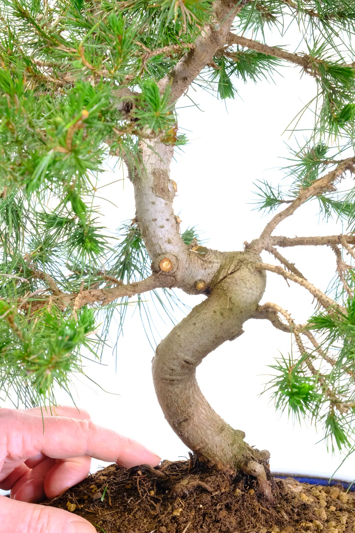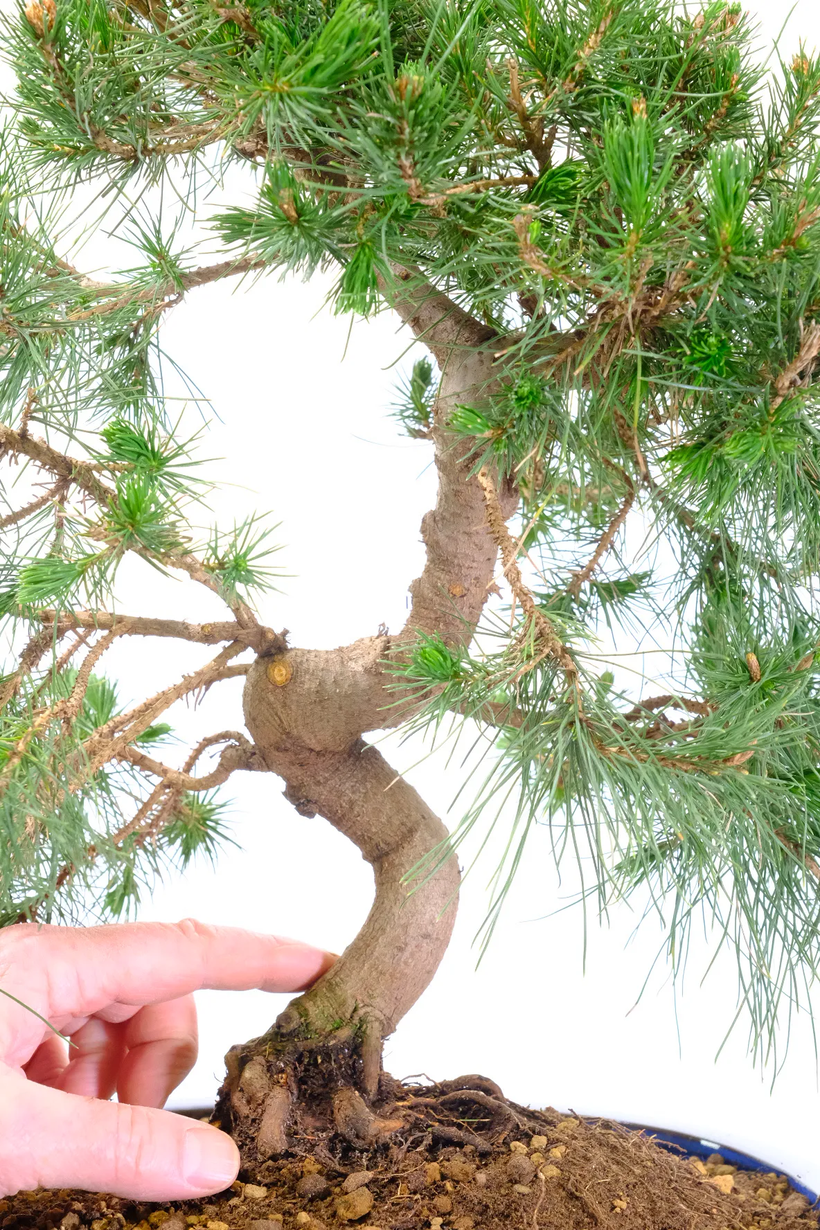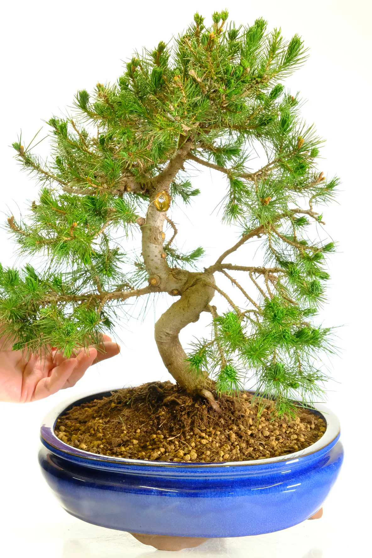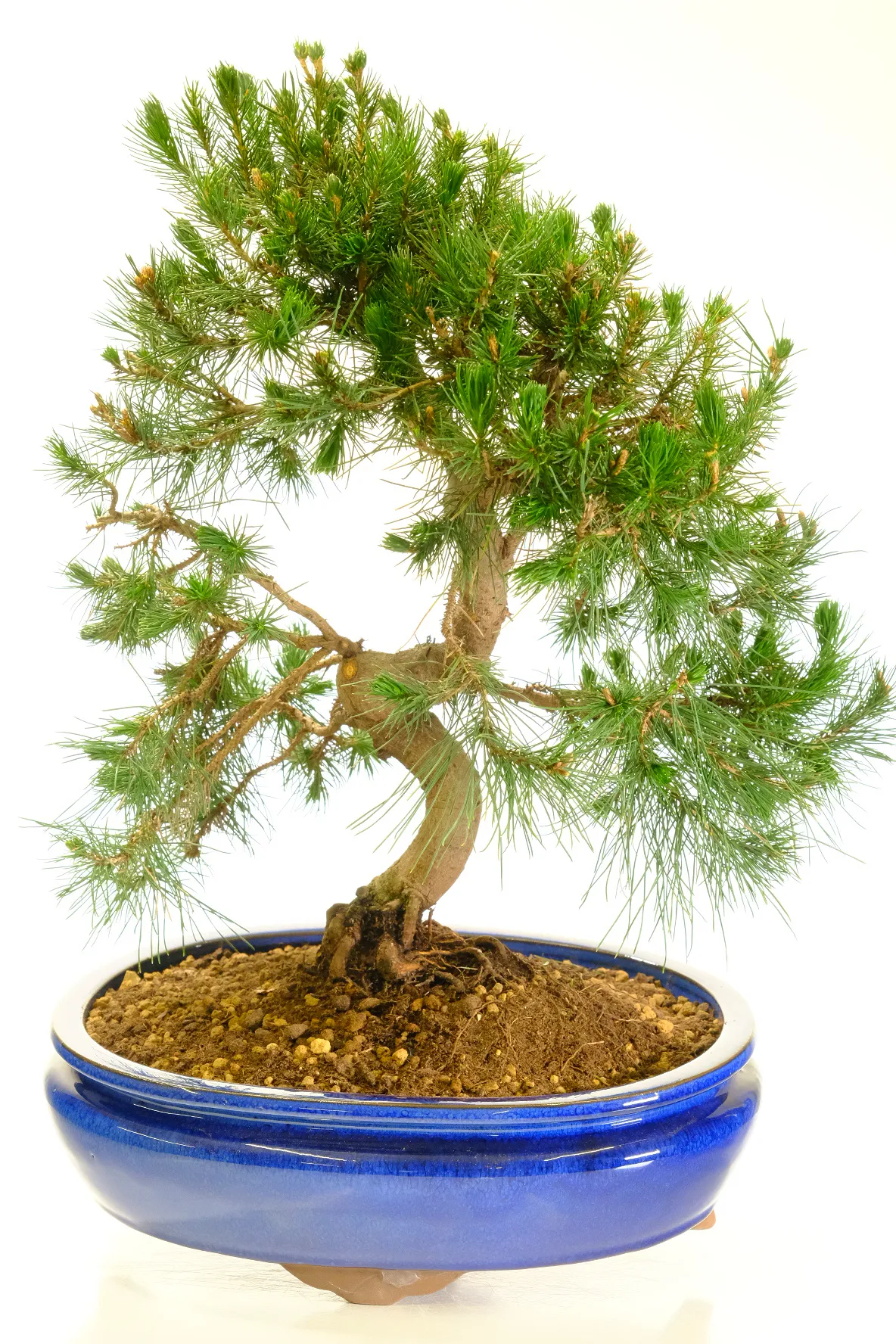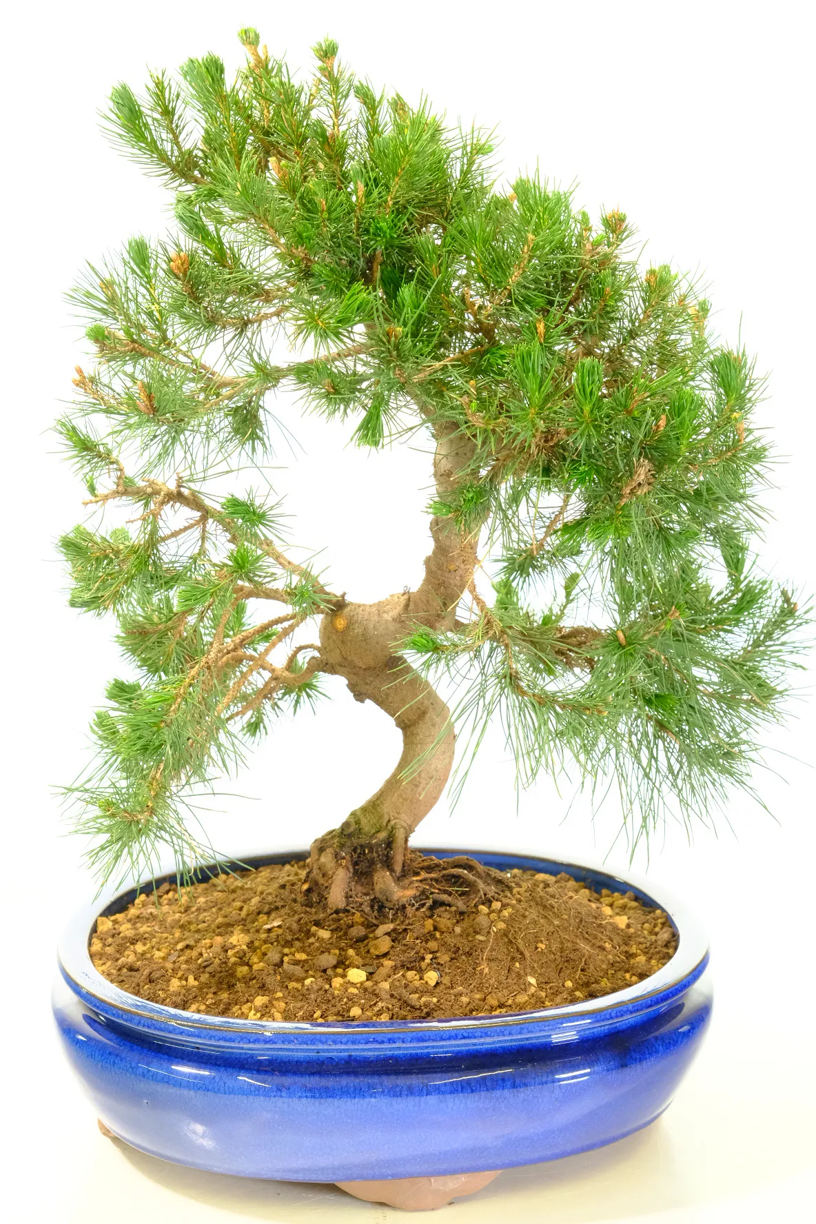This bonsai is presented in a brand new royal-blue ceramic oval pot. The rich glaze complements the deep green needles while enhancing the natural tones of the trunk and bark.
