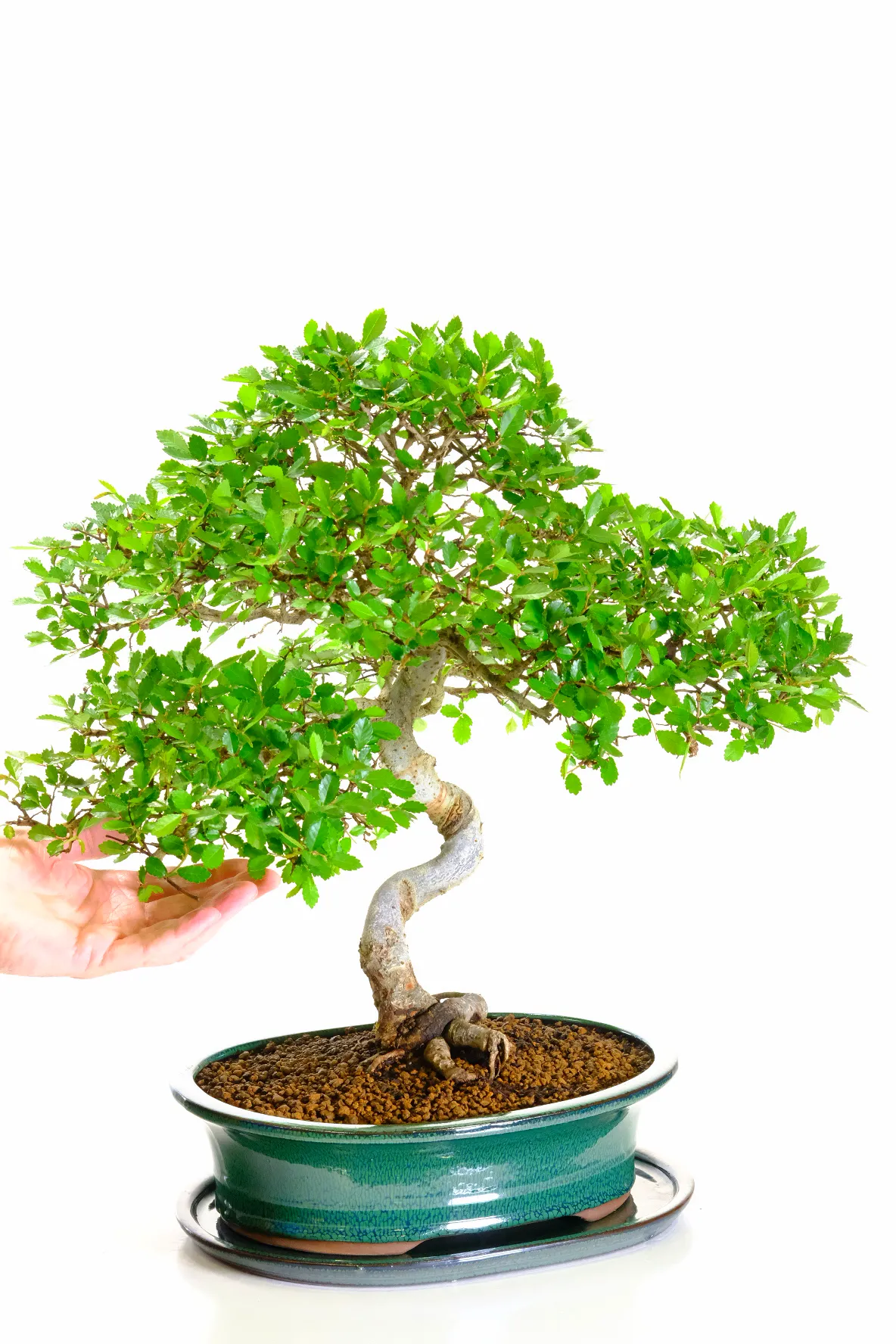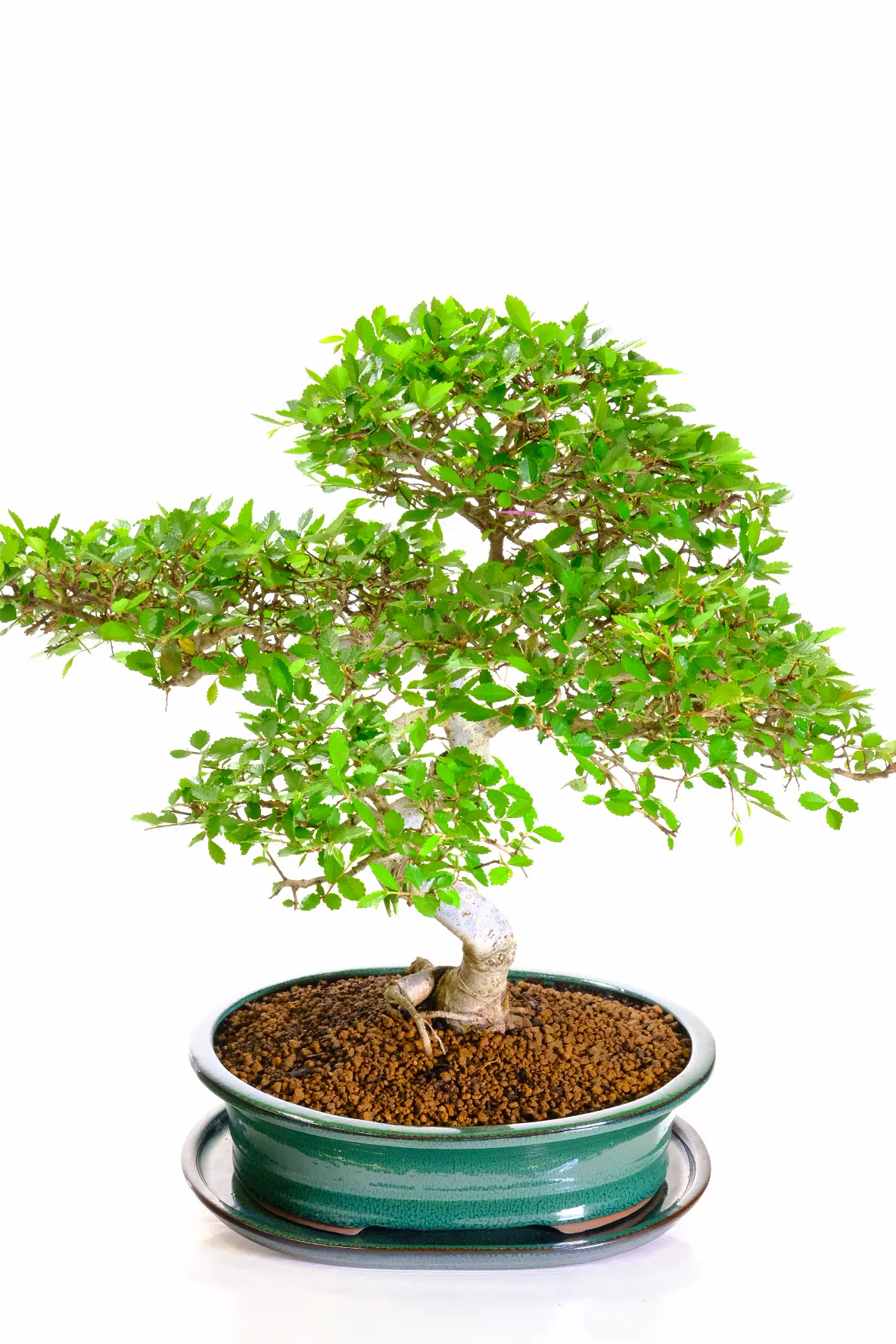 This large 23-year-old Chinese Elm bonsai (Ulmus parvifolia) showcases a thick, powerful trunk with beautiful aged bark and graceful movement. Its strong root flare and solid base give the tree a sense of stability and maturity. Carefully arranged branches form dense, well-defined foliage pads, creating a balanced and elegant canopy. The naturally small leaves enhance its proportions, making it ideal for both beginners and experienced enthusiasts. It is potted in a forest green ceramic bonsai pot with a matching drip tray for a practical and stylish display. You will receive the exact tree shown, carefully grown at our family-run, sustainable nursery.