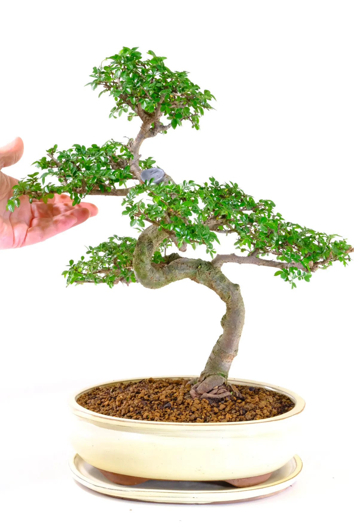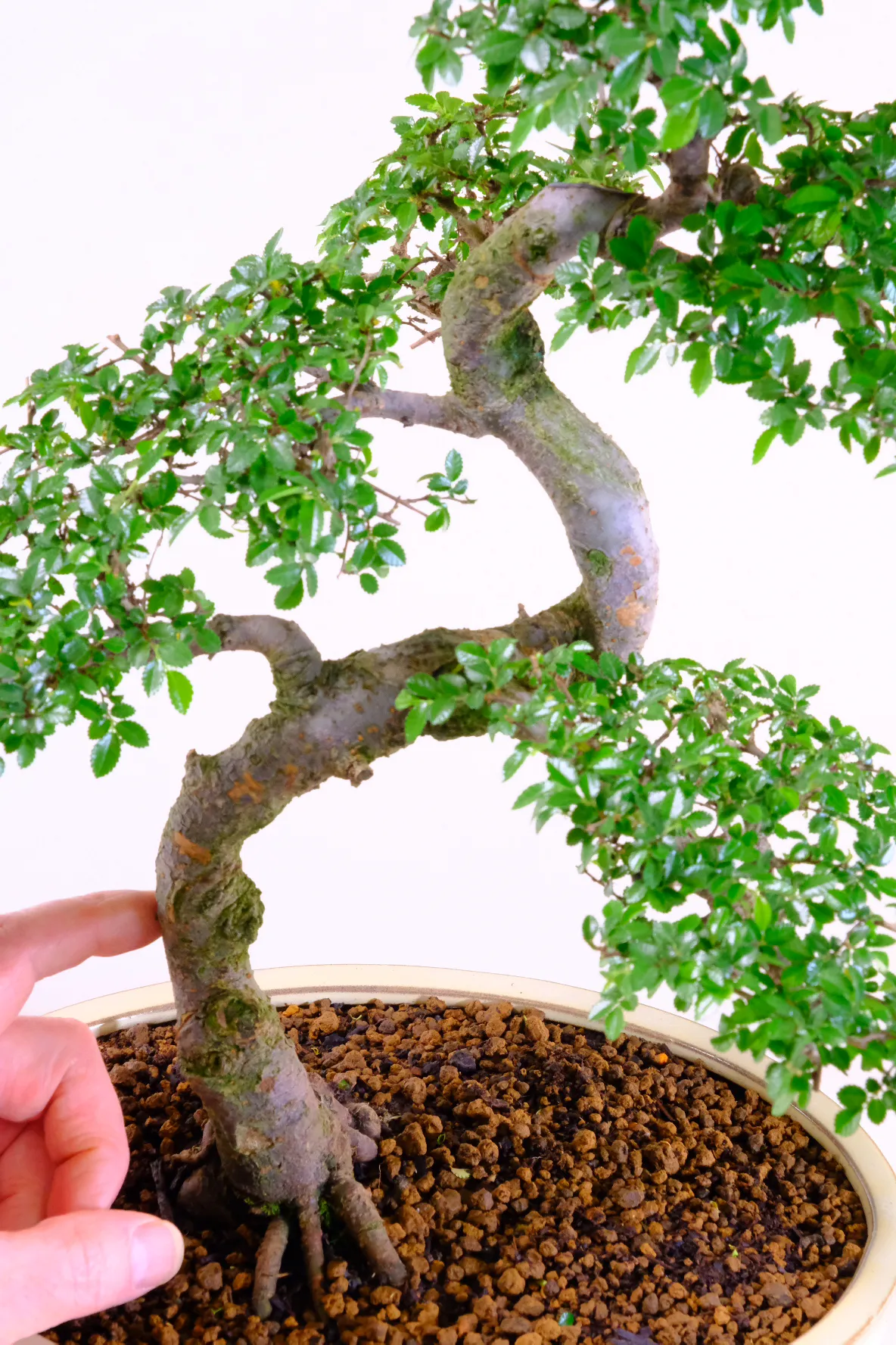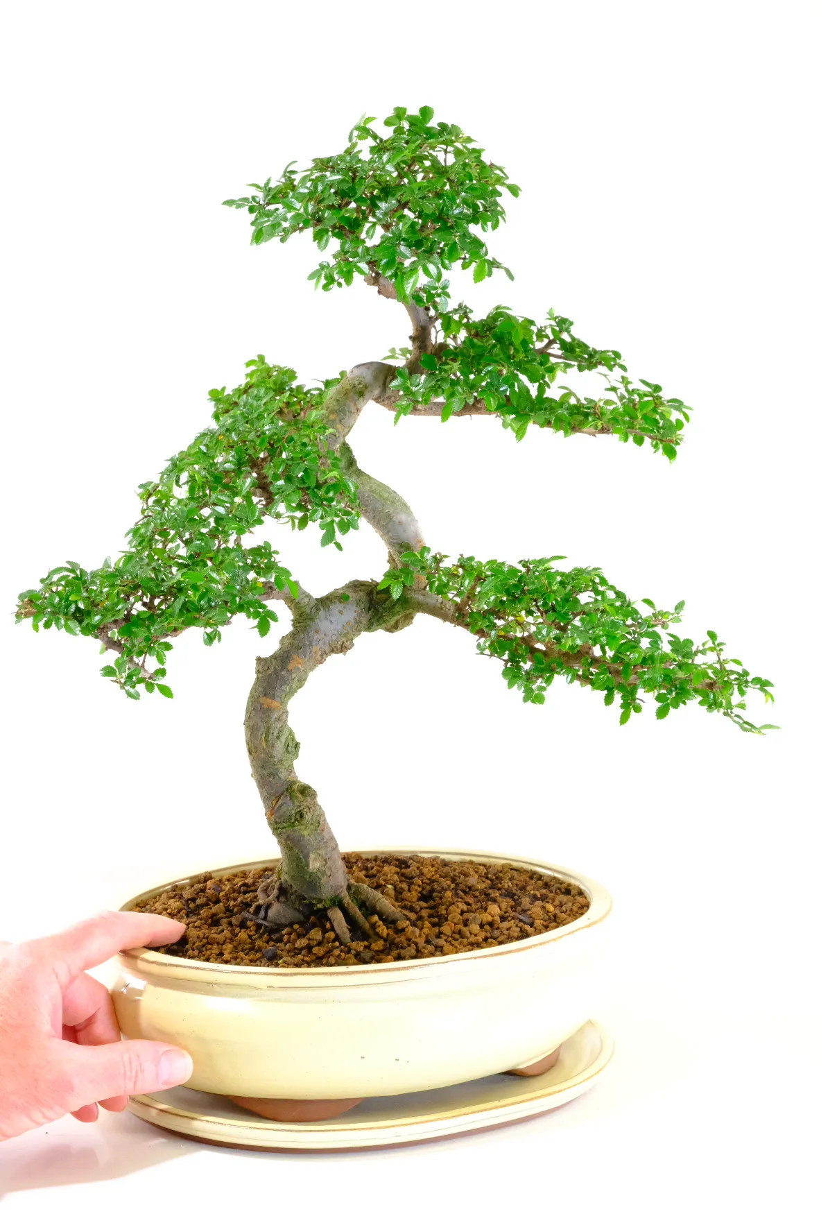 This Chinese Elm (Ulmus parvifolia) bonsai tree is a standout example of refinement and balance. The strong trunk taper, expressive bark, and well-developed nebari create a powerful foundation. Above this, fine branching and layered foliage pads build a full and structured canopy. At 20 years old, it offers maturity without losing elegance, and the recent refinement work shows its continued progression. Presented in a cream oval pot, it is ready to display as a true focal point.