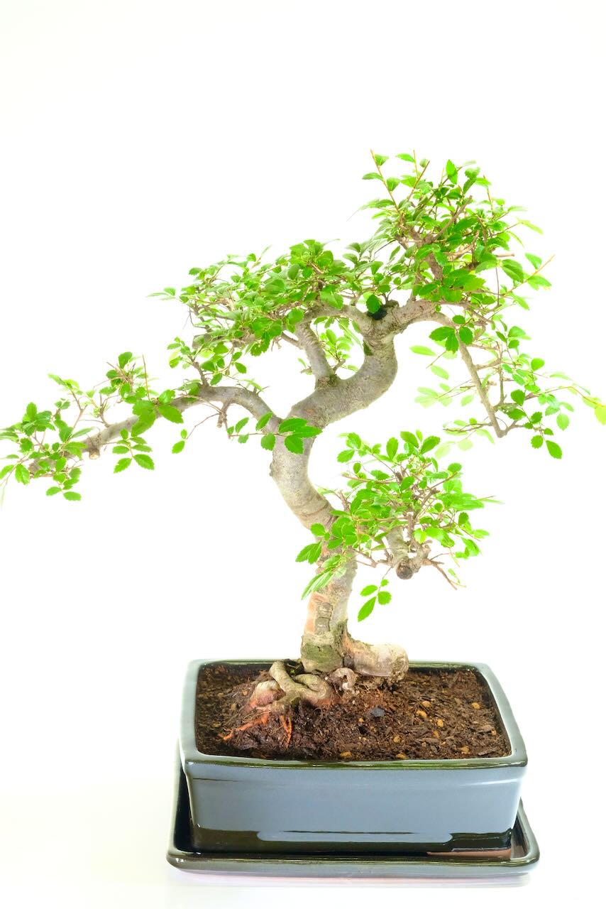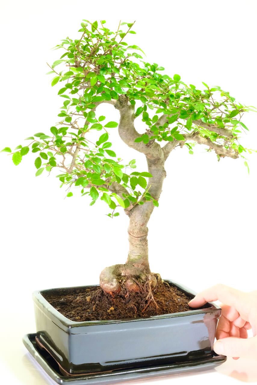 This beginners elm bonsai (Ulmus parvifolia) is a stunning informal upright-style tree with a twisting trunk, textured bark, well-defined canopy, and fresh, vibrant leaves, shown exactly as you will receive. Potted into a brand new gloss black ceramic bonsai pot. It includes a matching ceramic drip tray and combines sculptural elegance with approachable care, making it perfect for newcomers. The nebari – root flare is truly sensational. Easy to maintain, it thrives in bright, indirect light with regular watering, occasional feeding, and misting. Sustainably grown by our family-run nursery, it brings natural beauty, calm energy, and artistic charm to any space.