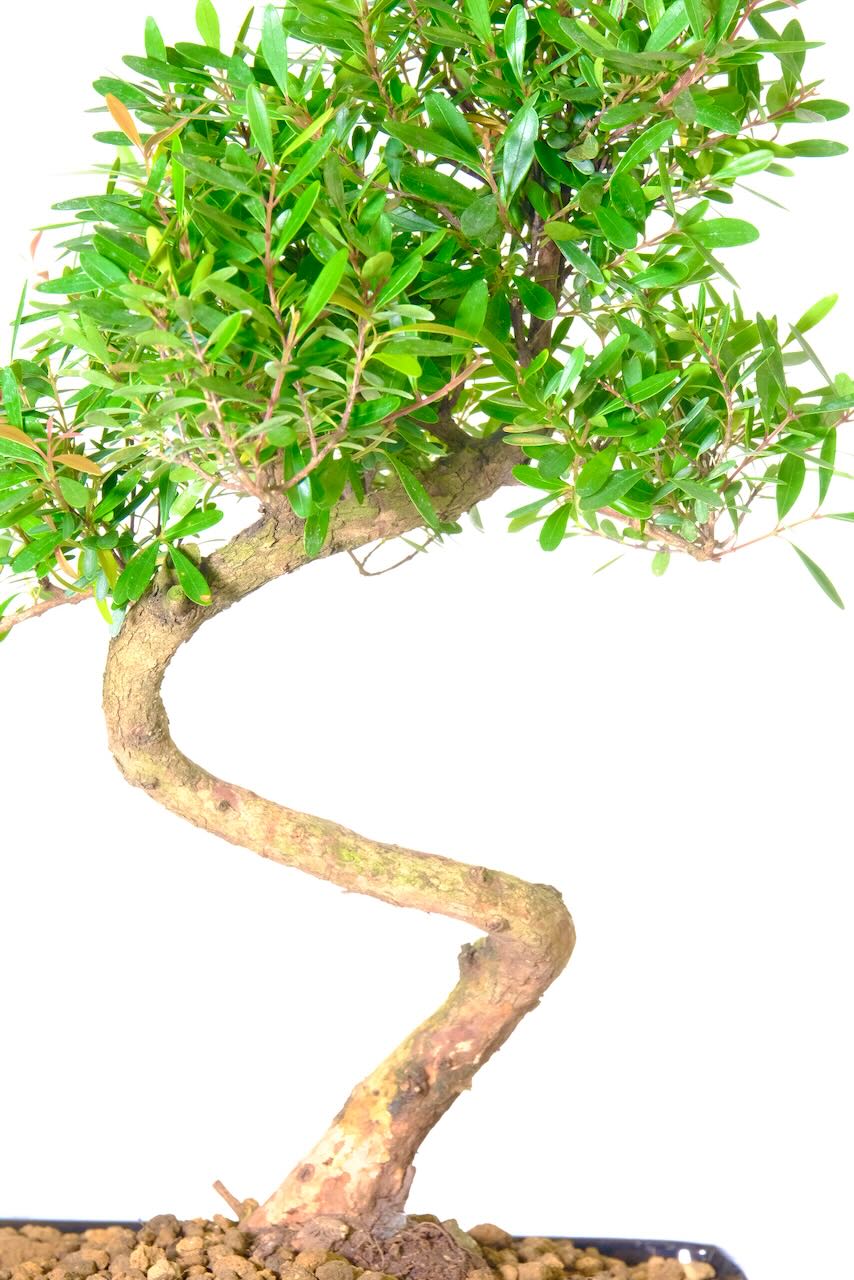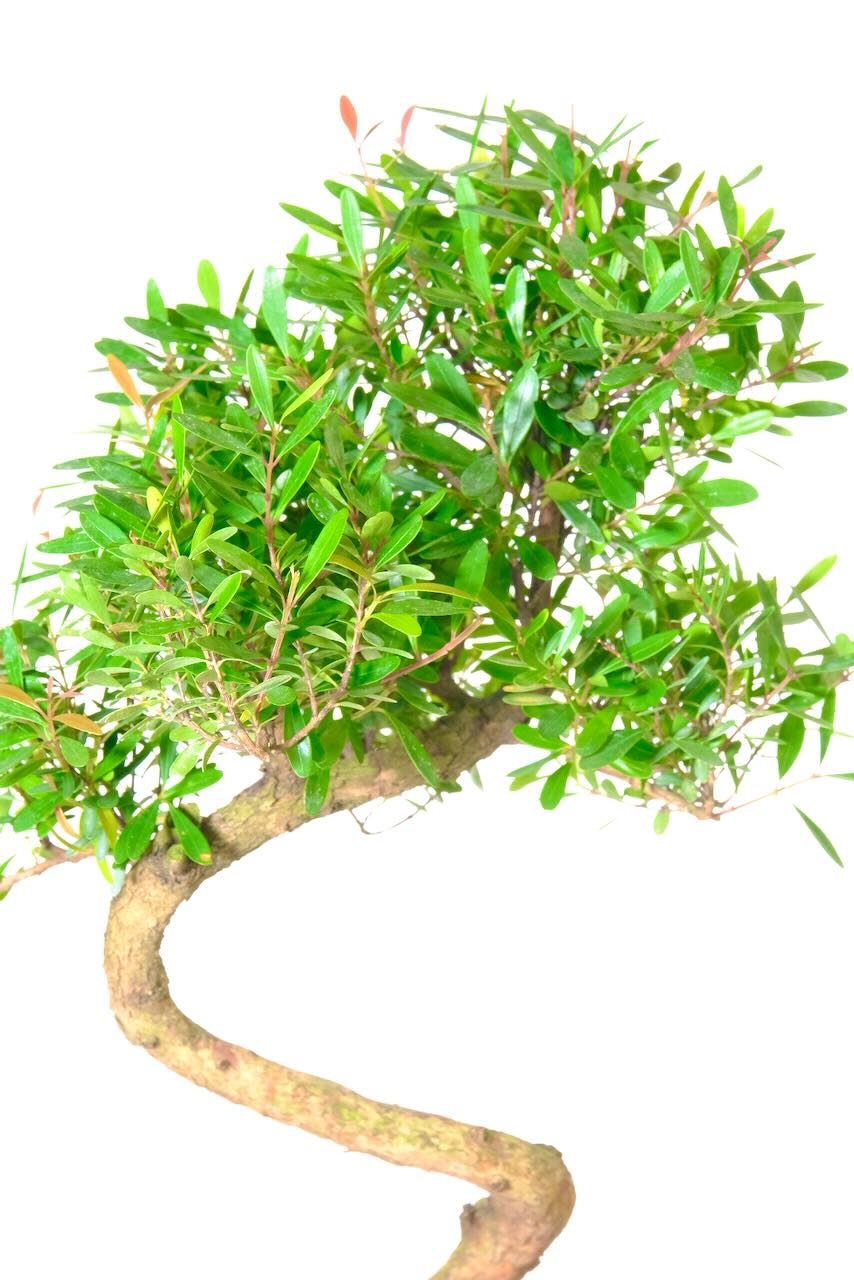Embark on a journey of timeless beauty with the majestic 13-year-old Roseapple Myrtle (Syzygium buxifolium) bonsai tree. A remarkable masterpiece that stands tall and graceful in the captivating realm of bonsai. Over the course of 13 years, this captivating tree has undergone a transformation, adopting a delightful s-shaped twisty form of beauty. Featuring an impressive canopy and delicate miniature flowers, this bonsai promises to infuse your space with the enchantment of nature. Marvel as flower buds unfurl, revealing foliage tips that blush with red hues, providing a sensory spectacle of vibrant colours and a delightful fragrance.