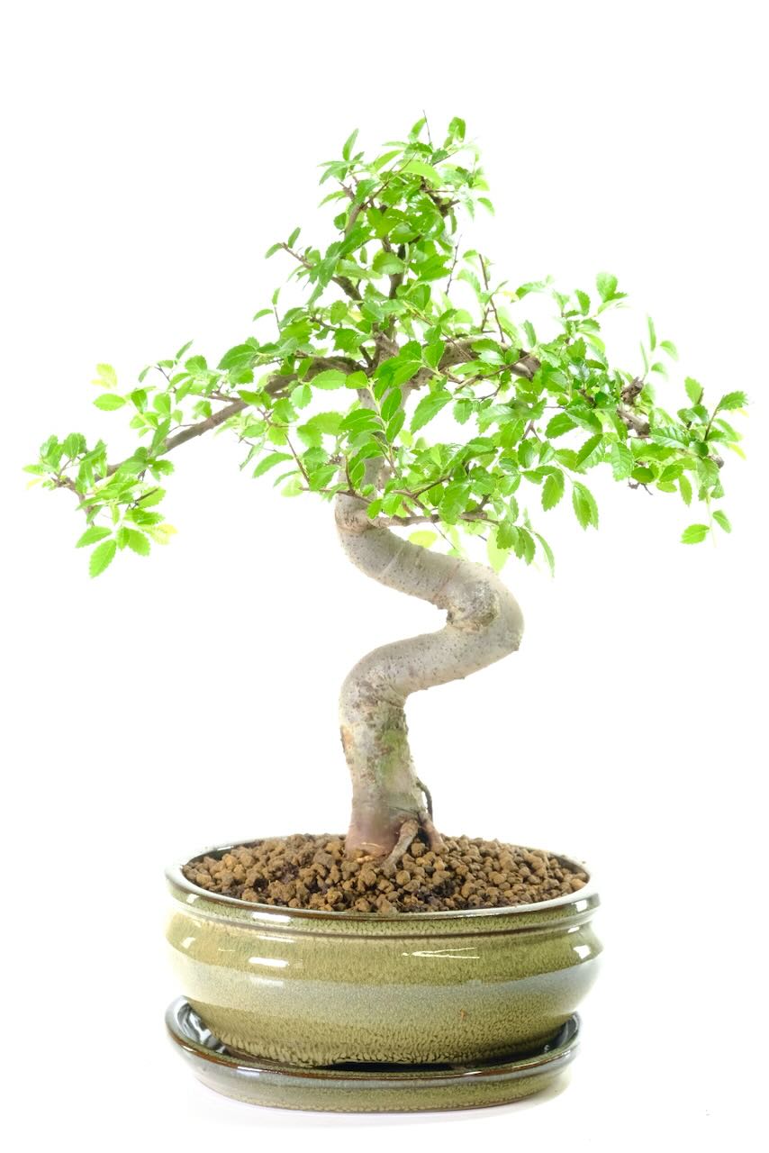 This beginners elm bonsai (Ulmus parvifolia) is a stunning informal upright-style tree with a twisting trunk, textured bark, well-defined canopy, and fresh, vibrant leaves, shown exactly as you will receive. Potted into a brand new olive green oval ceramic bonsai pot. It includes a matching ceramic drip tray and combines sculptural elegance with approachable care, making it perfect for newcomers. Easy to maintain, it thrives in bright, indirect light with regular watering, occasional feeding, and misting. Sustainably grown by our family-run nursery, it brings natural beauty, calm energy, and artistic charm to any space.