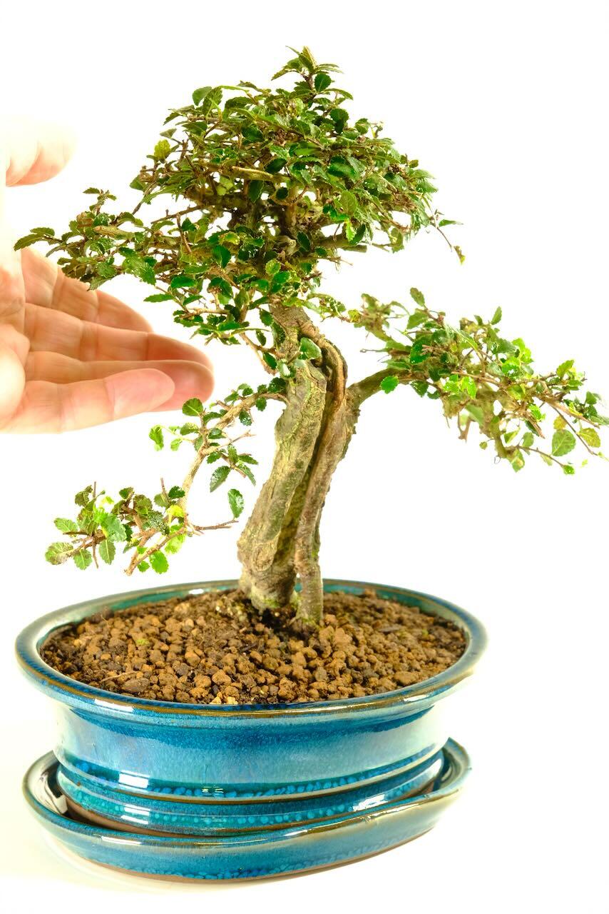 Potted into a brand new teal ceramic pot with a matching drip tray. Every detail enhances the mature trunk and fresh multi-tonal foliage.