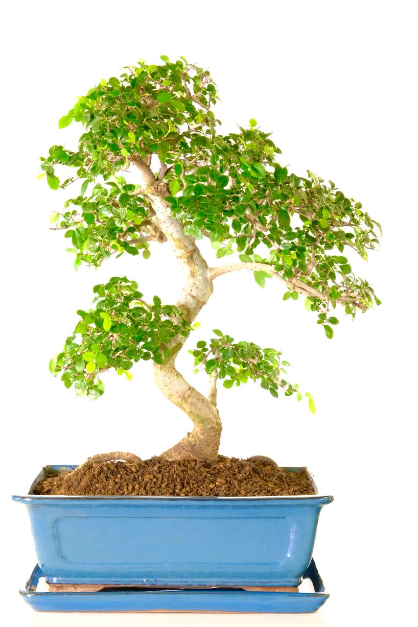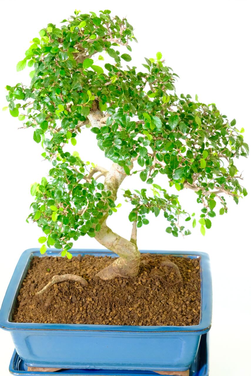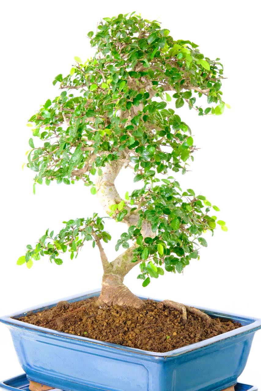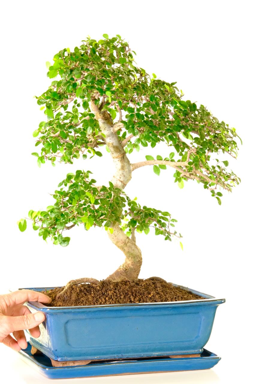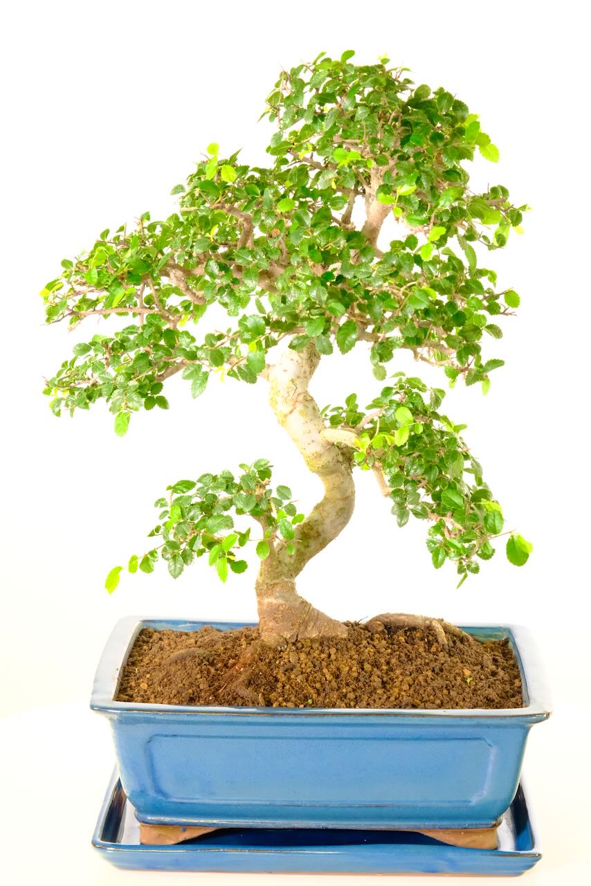 Arriving in a glossy leaden soft blue rectangular ceramic pot with a matching drip tray. This 23-year-old Chinese Elm bonsai stands at 55cm tall so although it is one of our larger indoor bonsai it is not massive or over-powering in anyway. Its age and size make it a standout and memorable gift. Ideal for those seeking a unique and enduring present.