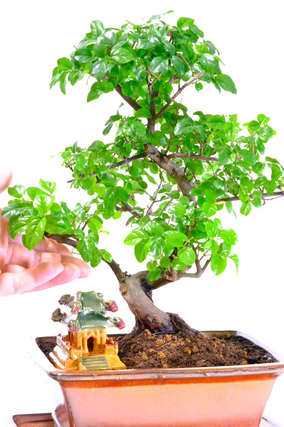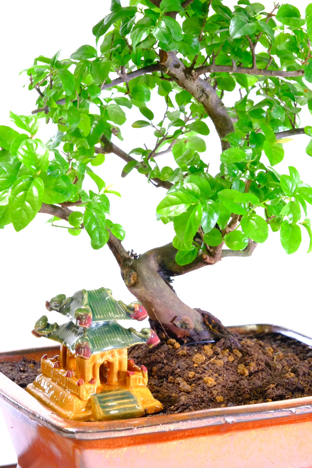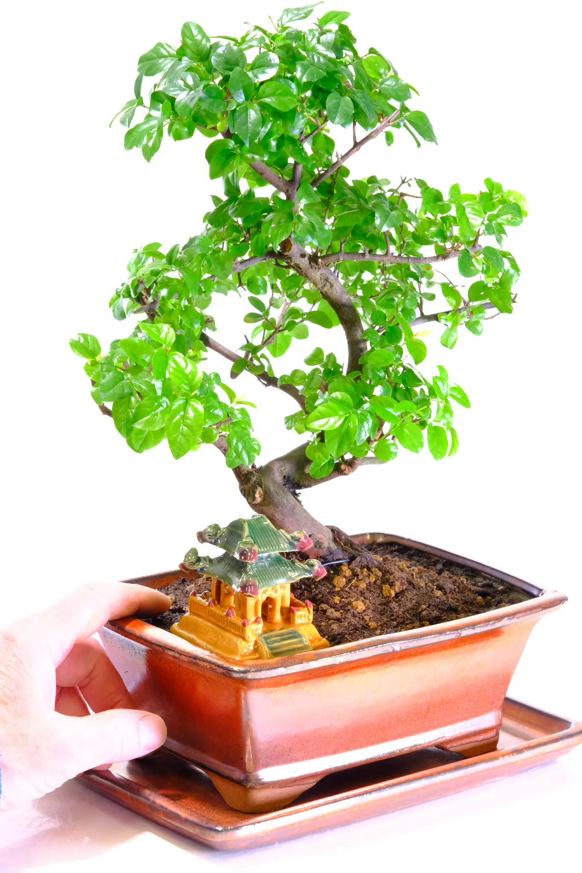This premium range Sageretia theezans (Chinese Sweet Plum) bonsai features a twisty, artistic trunk with flowing curves, smooth lines, and vibrant foliage, making it a striking indoor fruiting bonsai tree. Potted in a sophisticated mottled bronze rectangular ceramic pot with a matching drip tray, it will produce small purple fruits in summer, adding seasonal interest and colour. A glazed Oriental Temple sits beneath the branches of this choice indoor bonsai. Perfect for beginners and gift-giving, it comes with a care guide and optional extras. Grown by the family-run Bonsai Direct nursery using sustainable practices, each premium tree is individually photographed to ensure you receive the exact bonsai shown, reflecting quality, craftsmanship, and care.