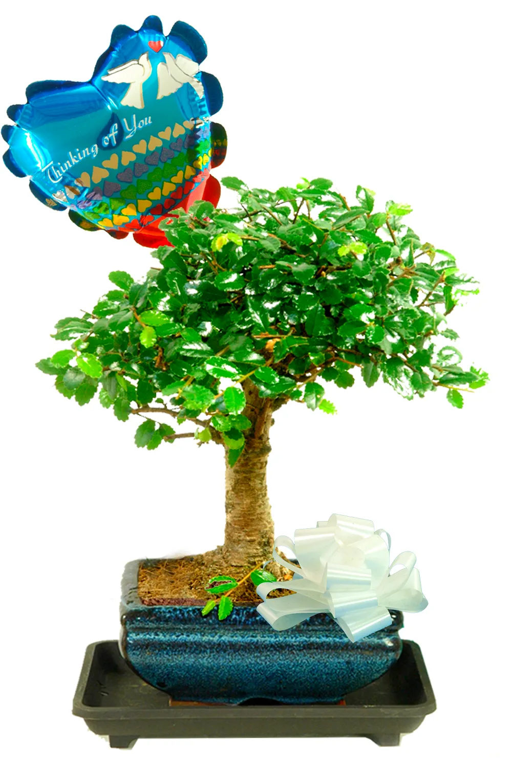 This gift includes the Chinese Elm bonsai potted in a ceramic pot, along with a ‘Thinking of You’ foil balloon for a warm finishing touch.
