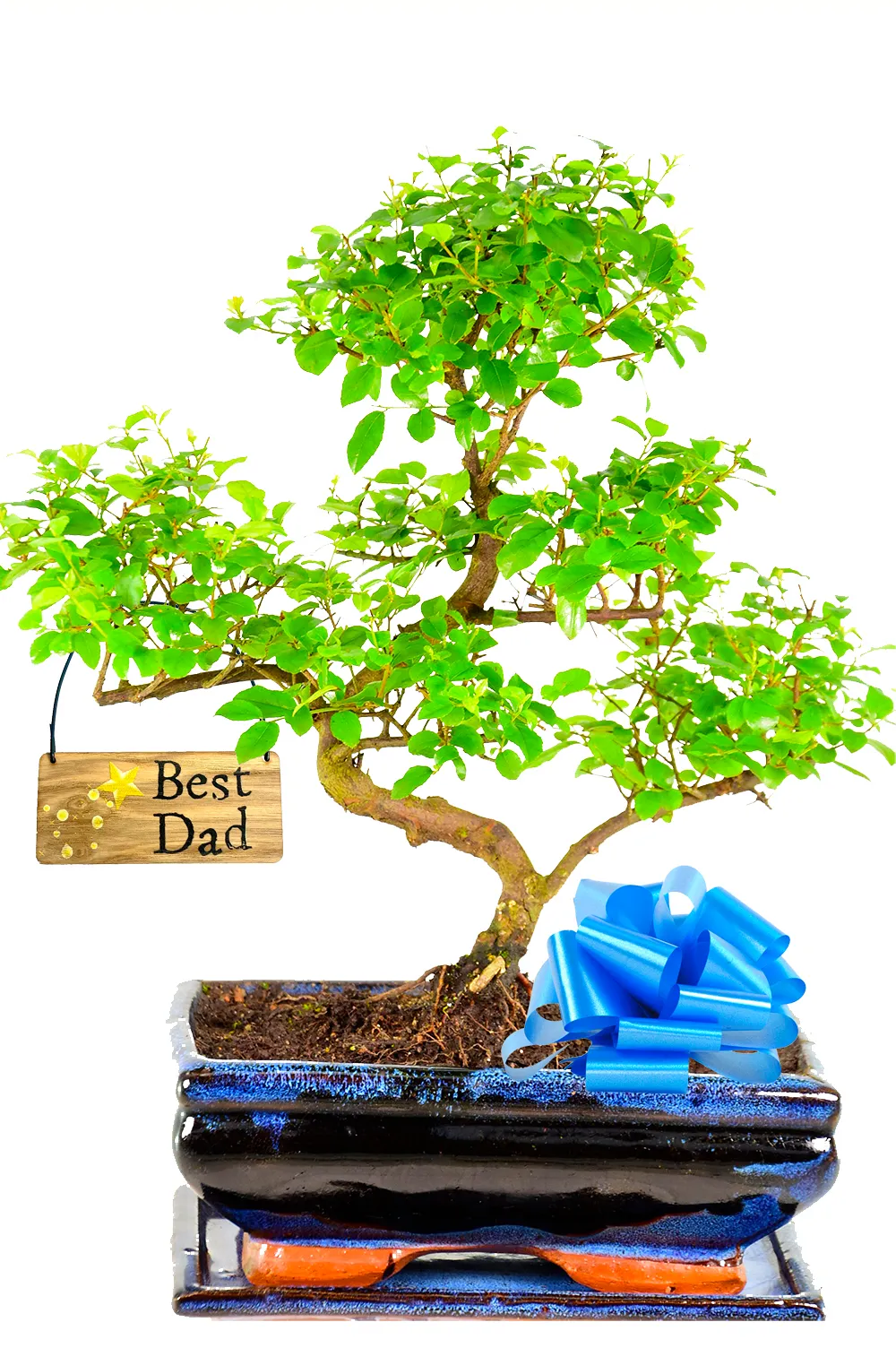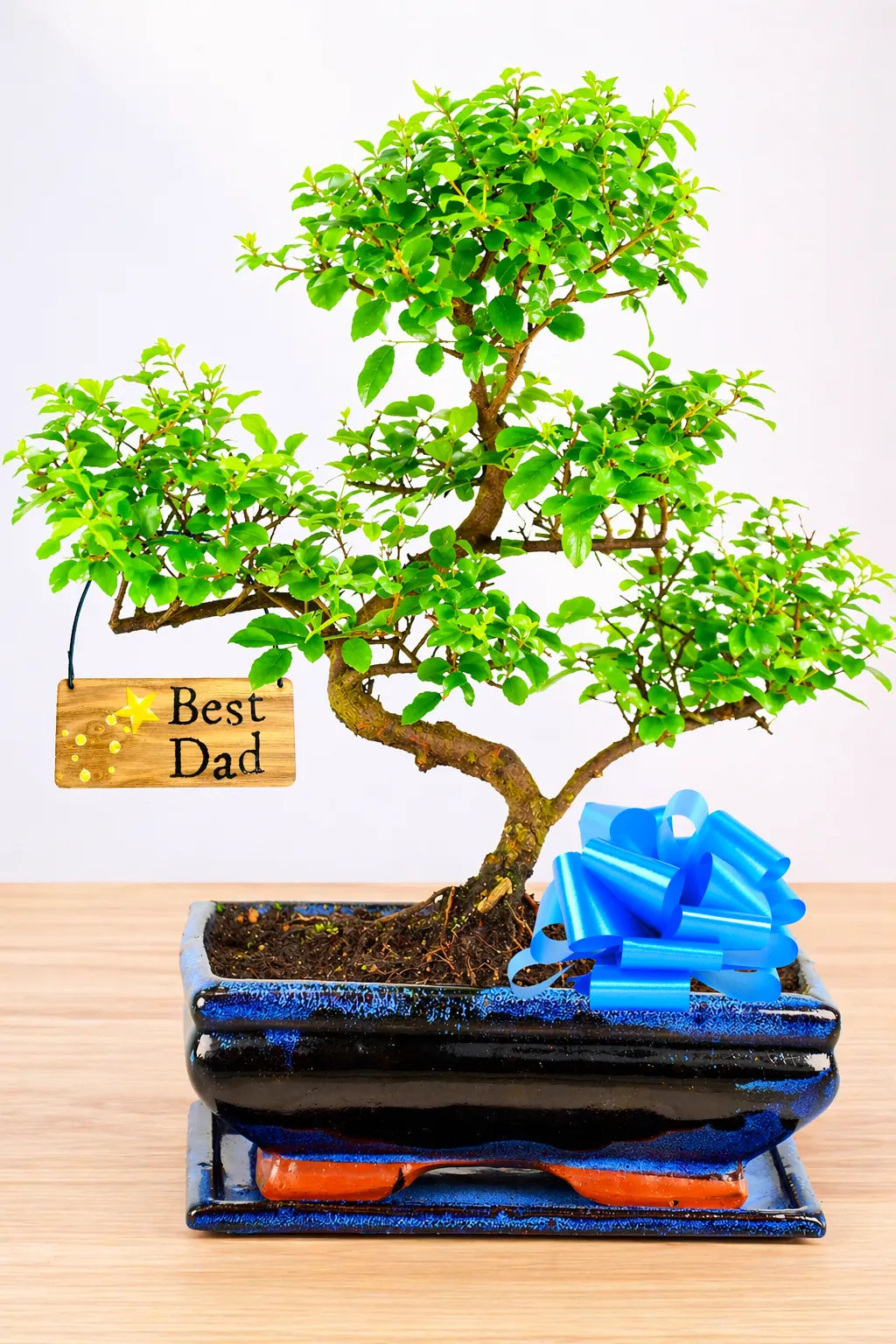 Looking for a unique and meaningful gift for Dad this Father’s Day? This 12-year-old Chinese Sweet Plum (Sageretia theezans) bonsai is the perfect choice, symbolising protection, creativity, new life, and warm wishes. With its lush green foliage, vibrant red-tinged leaves, and the eventual appearance of delicate purple fruits, this bonsai offers both beauty and lasting charm. Potted in a classic navy blue ceramic pot with an optional drip tray, this elegant bonsai makes a stylish addition to Dad’s space. To make it even more special, a “Best Dad” tag is included, adding a personal and heartfelt touch to this extraordinary gift. A truly unique way to show Dad how much he means to you this Father’s Day.