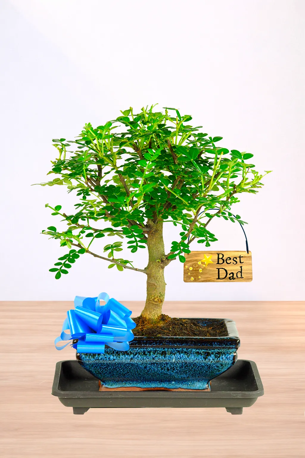 A stunning Best Dad gift that is truly unique. Featuring a powerful Aromatic Pepper Tree bonsai in a gorgeous Woodland style, potted into a blue ceramic bonsai pot. We have included one of our very own ‘Best Dad’ hanging tags with star design to create the perfect unusual gift. The Pepper Tree (Zanthoxylum piperitum) has feathery leaflets and releases a zesty citrusy fragrance when pruned or moved. Don’t forget to add extra care accessories and gifting extras when you add the bonsai to the basket.