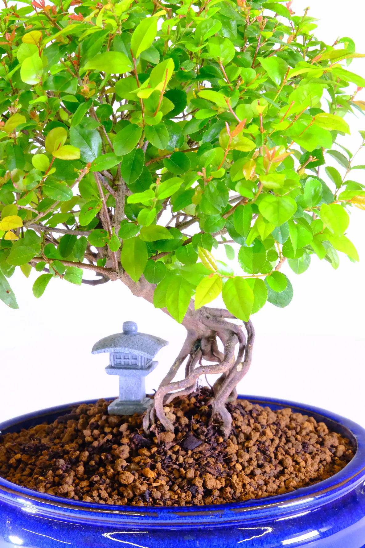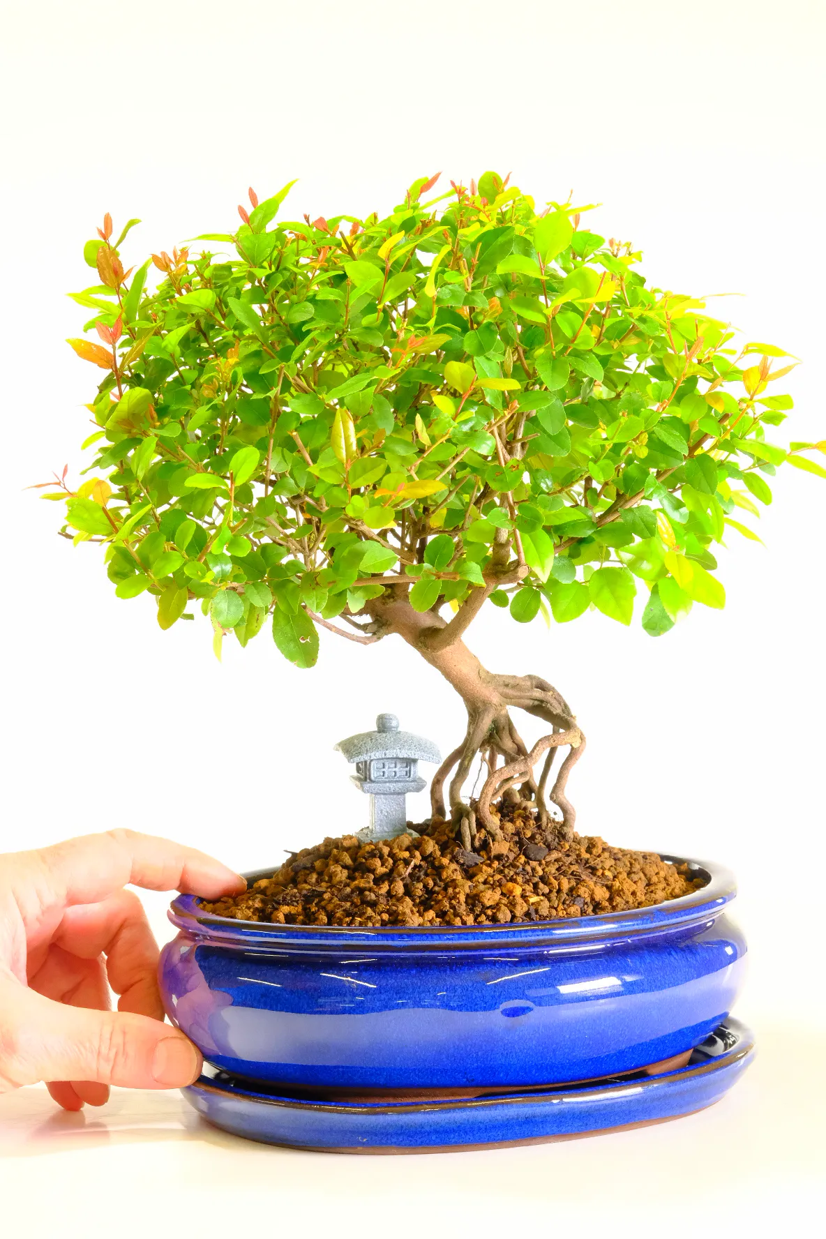 This Premium fruiting sweet plum bonsai features orchard-style charm, phenomenal exposed roots, and tiny plum-like fruits that appear in summer. A small Oriental Temple sits beneath the branches making a very traditional composition. You receive the exact tree shown, beautifully presented in a brand new royal blue ceramic pot with a matching drip tray. It is an ideal beginners’ bonsai, thriving in bright indoor light, needing regular watering, weekly feeding in the growing season, and simple pruning. Selected by Bonsai Direct’s family-run team, it offers character, ease of care, and year-round beauty.